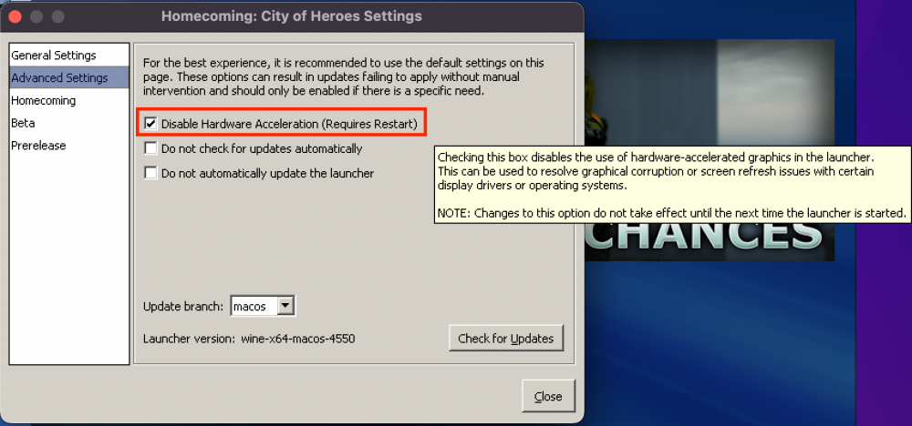 And I fixed that right up! Or at least figured out how to undo what I'd done. I had made a few tweaks in the settings like autoupdate, inactivefps, etc, but I'd also touched something related to Hardware Acceleration for some reason. IDK why I did, but that's what caused the error. So here's how to fix it when you do this exact thing. The thing I touched: (I had removed the check and not restarted the Mac yet) Open the folder shown: Open the File Indicated: Change the entry: (True means checked, False means unchecked) -