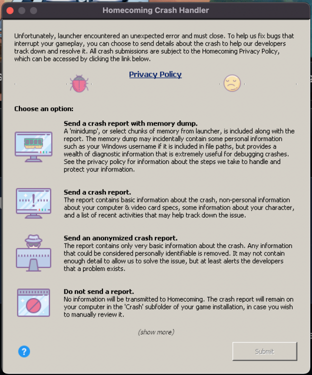 I'll probably end up editing this a billion times as I'm in the middle of a thousand things at once, but here's what's happened so far with this "New to Me" Mac and Monterey. Note: For me, this is not even a priority, I'm just posting as whatever the solution is, it may help others. So basically, I installed the launcher/game just fine (very quick and easy), but it got weird when I loaded the game. On my first attempt, I got the login screen, but it absolutely would Not allow me to type. I could quite easily interact with it otherwise, but it would Not let me type. I poked at the on-screen settings and also noticed that the manual graphics slider didn't show the full range of screen dimensions (IE: It didn't show 1920x1080, etc). I could choose the native windowed/windowless, but the game wasn't seeing the 3k+ pixels this screen appears to have. Lastly, once I closed the game, that's the last time I could open it as I'm not only getting a crash handler page (see below). I've closed the launcher and tried again a few times, but same thing. I plan on reinstalling the game/launcher, but I've yet to see this popup before and it comes up prior to me even getting the login screen as before.
