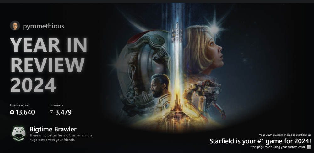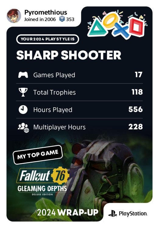 I've not received the links for my other consoles yet, but they won't be so hot compared to my PSN. I'm pretty sure my CoX would be in the negative. >.< Year in Review Links: Nintendo (not live yet) Playstation Xbox Note: I Just started playing F76 this past month as I've had 1 wk each off for both months. I played this at launch I believe and got through a bit of content, but haven't worked on completing everything yet as I was last trying to sort out the moving materials between hubs thing.