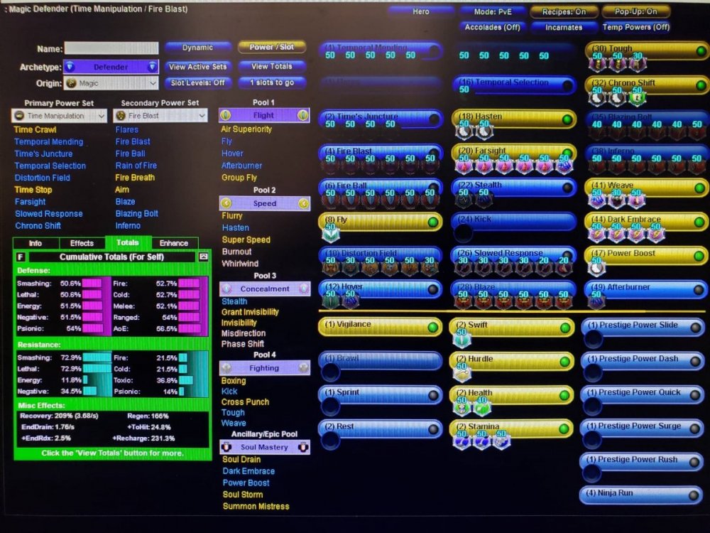9. Time really grabbed a hold of my interest after doing a bunch of forum lurking, so I made Time Torch and he has been very fun. I just hit 49 and plan to hit 50 very soon and will do a respec. Right now my build is close to the one I am posting below minus the ATOs and Purples. I also have Time Crawl and Time stop and no Distortion Field, but will spec out of the Crawl and Stop and take Distortion Field (proc'd out). So, I would love to hear some of your opinions on what I came up with... I do have Distortion Field 6 slotted completely with procs which I plan to start with, because I'm interested to test the effects of all those procs. Build: http://www.cohplanner.com/mids/download.php?uc=1455&c=688&a=1376&f=HEX&dc=78DA6594D96F125114C6EF9D198A4059BA6F505ABA4AE9144A6B5C63D2CDD45AD358DF09B6539C84026131EDA3EF3EF95297771F7D70698D6FFE112E511F8D4B22D5444DD4C4E061BE536A64C2E4379CF39D73BF7BEEC0F2D65CE3FD73D7CF0AE9994D270B85C49CB16164D68DBC6D399932D744F5B2D31D3C8827664A1B1BFA6573D3482C273366AE944E16CD6CA6BB96BF94CCA48C757DC1CC1B89196A5914AE956C36AD2FA4CDD4D5A2D37A5ECD19C67A93F5B898B96616CC2B66DA2C6EBB21ACEACC4CAA673E67AEE9B3D97CBE942B66F389D56C294D6B168A467EBB932C0DD3FDBC55F055D1845F1522A60925C0EC05B520B30F7C7F58431FBAC40B8A484454B9AB58AA237BCCA7A0F309F881B42AB43635AA2117031BA79993A0270E86A7C08F546BE35ADB03B86978C87C047A1E83BE5D707C0F74D129D8255CDBFF482BF68AFA39B89FE337FCF9EE512EA089E6457C6FDE84B6751E7D5A93C83BA89F0BB5D23520AC5C7B1BB49FA8AF9BA7EA9E449FF638D839C59C06BB8F812FA9C6CB53F58EA15F88D6688267D9C4B16EE66BD2B720676B71615DBF9BE9047BBD4C0F93FDB9A96F1B7B6FEB47BF3ECE2994EB601F1DD6E9BEA195BA784A5D36D5DA7D9FC294607F035325B6109F29163F536D0FD7F644B0D38171A6CE9C0007A3E0440C54C949003B5402314C3F3C09463A700A6FA97F9035419ECCE001CBD0964913620FA11DC28826866F316F33EF802377C17004B5FB543BC4B543C7E16BE404F32478F414F334F30CA891FF51F636CAD38D2C614E916FE8BF451883461DFBC16FEC77E64F30F60B7CD72884CE6FB0CE7B14ED4244F9B4A2BC865FFBFFF7B914AE452AE1BA6CB42E12AB8BC4EB225375910B75918BD5081C5756B4DA7F849056D6E1ABFD1354CA4ECAF2DE24FF9ABE1CC6A4ECE7599C97D6F9ECFFAB1F85FEEB614C913BFC2EDD64DE00FF022A5BE46A