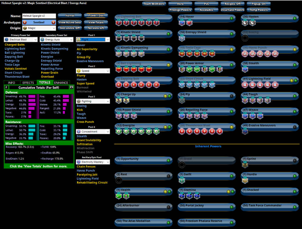 I just thought up another change overnight...the +5 Steadfast Protection resist/endurance piece can be replaced with Unbreakable Guard res/end. The result is that gain 2.25% more en/neg resists in set bonuses and a tiny bit more S/L resist because it would give stronger enhancement to Tough. Another change could be replacing Thunderstrike in Lightning Bolt with 5 slots of Winter's Bite. This would give you a bit more energy/negative defenses and save 1 slot, and would bring your slow resist up to 95%. For that free slot, you could choose to slot something for survival like more a regen or psi resistance proc, complete the Synapse set in Short Circuit for 4.5% en/neg resistances, or add a damage proc to Tesla Cage for a little more offense, or maybe something else.
