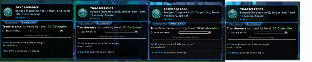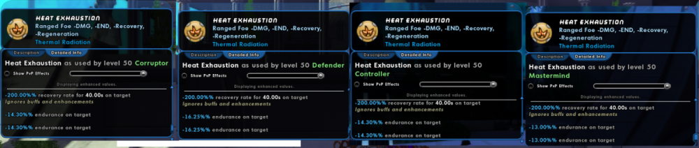 -end values in this game are in a weird place right now - for most power sets their endurance drain values are the same across ATs - power A will drain X end on both ATs Y and Z. This is true for almost all power sets and ATs - except for most support sets. Not all though - cold affinity has consistent -end values on all of its powers across all ATs and not thermal radiation, in spite of both of them being introductory corruptor sets that were proliferated at the same time. Kinetics has different -end values despite being on two ATs on issue 0. Poison technically has the same values across ATs but its only -end source is on a pesudo pet so s h r u g. As you can see, corruptors/controllers get 88% of the endurance reduction value in both cases, and mastermind gets 80%. Controller/Corruptor values for buffs/debuffs are mostly at 80% of a Defender, and Masterminds are 60% so I don't really know what their thought process was in balancing EndDrain. As far as I'm aware, there was an intent to make blasts (such as electrical blast) follow different values alongside support sets in issue 4 (https://paragonwiki.com/wiki/Issue_4#AT_Balance) but that doesn't seem to have ever gone through for blasts (and then way later when sentinels were made, their armor -end values were never downgraded). As a wise comedian once said, "by all accounts it doesn't make sense." Given the general intent of the game is for defenders to have the highest values, and the overall meh state of -end, I suggest considering their current values as the "baseline" for the lowest valued AT with them (Sentinel for Blasts and Armor, I...think the melee powersets would be unaffected since melee ATs all have the same debuff values anyway and I see no reason why end drain would be any different?). Overall results would be a buff to Energy Blast, Energy Aura, and Electrical Armor's endurance drain for non-sentinels (or a nerf to sentinels/buff to defenders across the board if blasters/melee armors are considered the norm, poor sentinels), a nerf to Cold Domination and Poison's -end for non-defenders, and a nerf to Electric Control's -end for Dominators.
