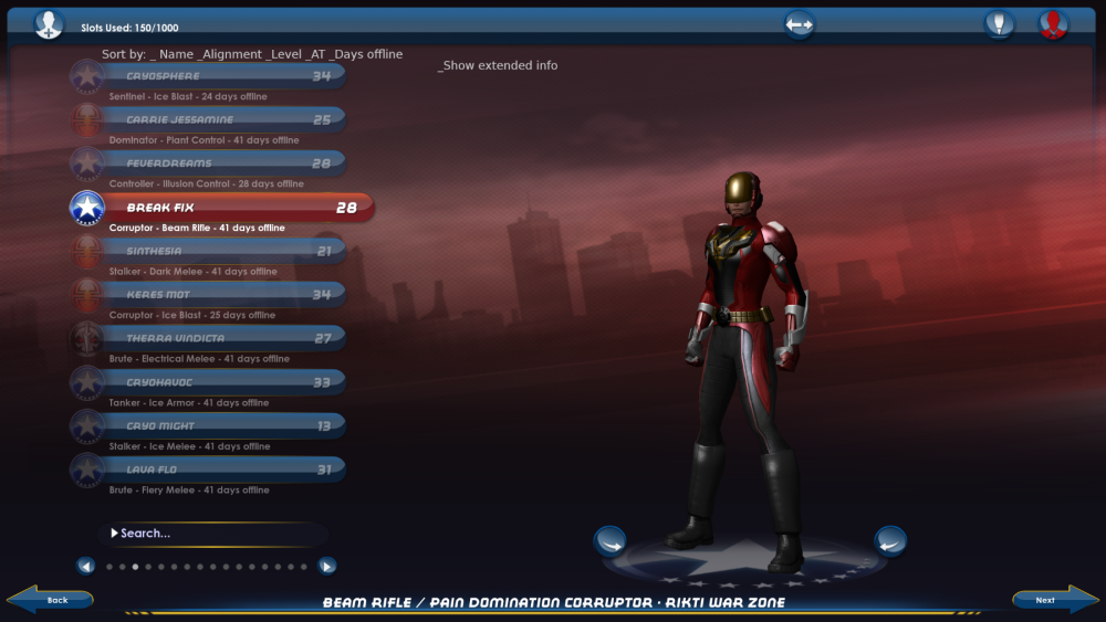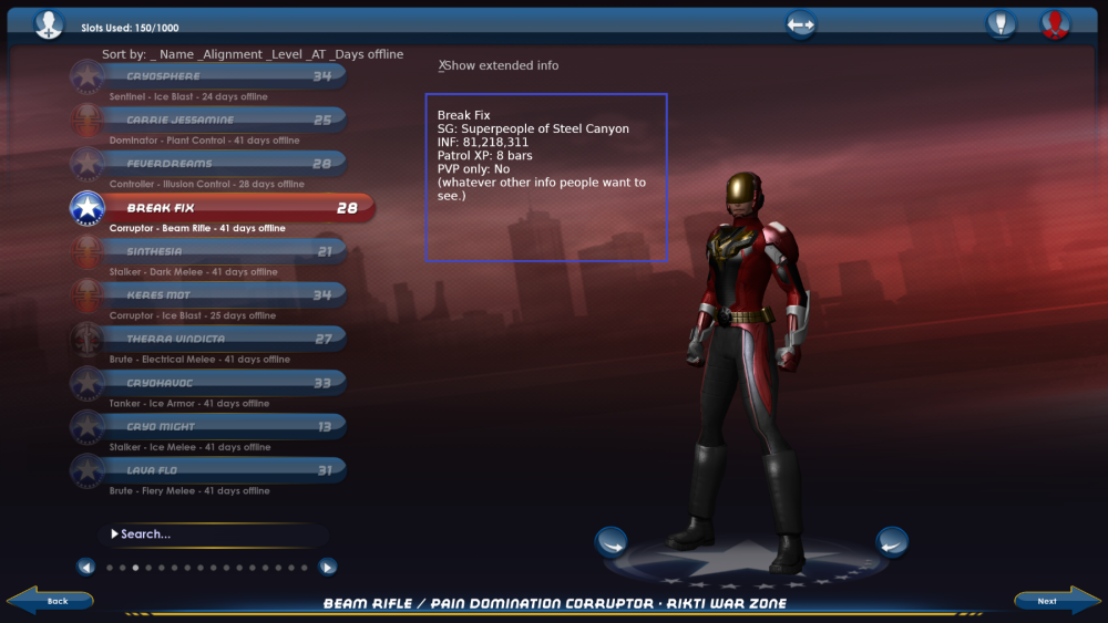 Patrol XP Indicator At Character SelectGreycat replied to Calculator's topic in Suggestions & Feedback The character select screen could use a lot of tweaks - a general overhaul, honestly. This, for me, is something I'd *personally* rather see (with things like SG, INF, etc.) in maybe an "extended info" screen or checkbox instead of the main character list - assuming it's something that can be communicated to that screen. (My understanding is that some things just aren't visible at that point. For instance I don't think # of AH sold/waiting items would be able to be seen.) But, if some dev's looking at ideas for a character select screen revamp, yeah, put it on the list. (I'm thinking ending up with something ... well, done better than the quick mockup below - stuff obviously on screen and sortable as quick filter checkboxes, with space for more stuff in an "extended" info box you can select to have open.)