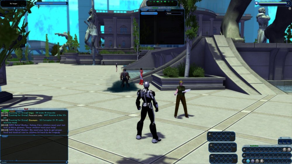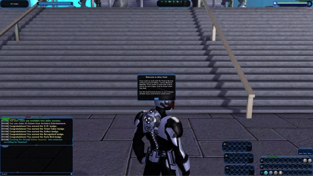 (Note, this is specifically "what you first see stepping in Blueside." Redside, you're dropped almost in front of the Arbiter and it's obvious you should talk to him.) So there you are. You create a character, pick hero (because it's city of heroes, of course) and whether you do a tutorial or not, you get dropped in Atlas Park. What do you see? This. Granted, without some of the messages on the side, but that's irrelevant. You're faced with a flight of stairs and a bland dialog box telling you to do stuff. Where is this find contact thing? Where is Matthew Habashy? You then get a followup of a second box telling you you can mark yourself as needing help, nothing, or a helper (and does anyone actually pay attention to those colors?) So what do you do? I mean, head up the stairs (you probably see other people up there,) but then what? This - is an awful experience. Also, if you go looking for Matthew Habashy, is he at the top of the stairs? No, that's Ms. Liberty. This guy has to be obvious, right? Is he? The gold thing over his head isn't even visible, he's WAAAAAAAY in the distance there - and if you actually read the opening dialog box and want to try the origin contacts, you have to go hunting. I'd say we need to fix this. First, move Matthew. Put him at *least* in that front corner. (Yes, I'm aware of the phasing thing with his wife. Move her with him.) Make him visible. Second, change that opening dialog box. Make it more like a mission (or AE contact) dialog box. Have his picture in the corner. "Hello, I'm Matthew Habashy. I could use your help. Come up the stairs and see me, I can help you start your heroic journey." Not "find this other dialog box in another window." He should have an option as well that basically starts a mission - "Would you rather start with your Origin contact? They have short missions based on the origin you've chosen for your character." If you pick yes, you get an arrow on your map (and directions to follow it) taking you first to City Hall, then to the contact. Matthew should also be the initial "getting started help resource" and it should be obvious to go to him. A "You have questions?" going to a new page with him with things like - "How do I get new contacts?" "Well, when you finish a story arc from a contact, they'll often introduce you to a few other people. Or you can use the Find Contact window" - with *screenshots* of where to find it and what it does. "How do I get to other places" pointing the new player (again, with a mission door indicator) to the tram station. "How do I make my abilities stronger" going to the vendor and/or giving an explanation of enhancements - not the invention system, though that can be mentioned later, this is just "This is what they look like and this is what they do, here's how you use them." Even things like "How do I join/start a supergroup" (walking you to the registrar) and "how do I find things to do / get more help" - the last describing how to use the Help channel, in game help (itself probably needing more revamping) and linking to both the wiki and the forums for more detailed information. Heck, I'd even throw in "What's a DFB," since a new person will see that advertised, and maybe a list of really common acronyms - yes, they change, but some just haven't. (This should all probably be visible with some sort of radio to Matthew, too... though that might play merry hell with the contact window.) Last, an option in options that says "ok, I've done this before and don't need all of Matthew's help." You can still see the help options by walking up and clicking on him, you just wont' get all the dialogs and such. Again, you can do the same thing with the arbiter redside, but I think it's more obvious red and goldsides with who you have to talk to first.