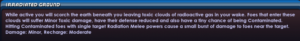 I don't know if this is known or intended, but the in-game verbal description for Irradiated Ground for brutes states that it does Minor Toxic damage. However, the Detailed Info reports that it actually does Fire damage. I tested this in combat (turning on the Pet damage reporting to see the damage from the IG pseudo-pet) and yep, it's doing Fire damage. Which is wrong, the description, or the power?