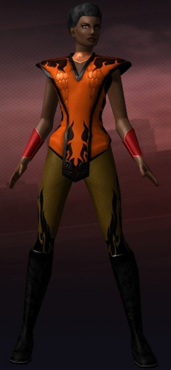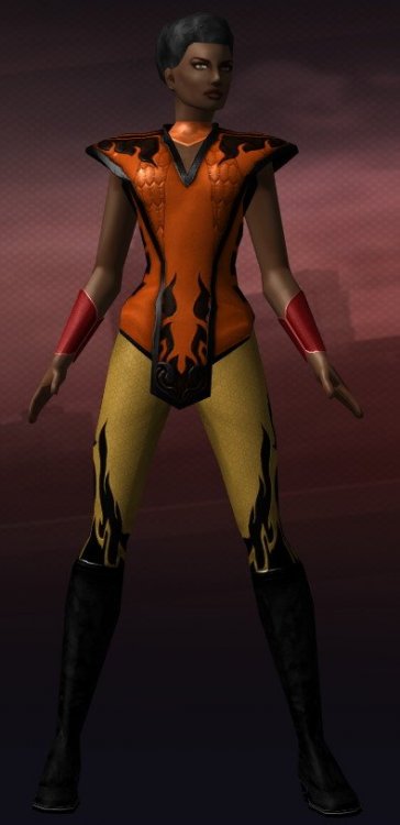 Having decided on Fire and Dark as powersets the name Ebonblaze presented itself as the logical choice (because no way Darkfire wasn't taken). Combined, the name and powers suggested the colors for the costume--black and orange. Problem: Black and orange are Halloween colors. (Incidentally the colors of one of my state's universities, something I've long mocked them for, because their original mascot was a tiger.) I seriously considered dropping orange in favor of some other color, but worked at it, trying different approaches and what resulted looks pretty good to me even if the color palette diversity is extremely low. (Hmmm...how crazy can I get with colors?)