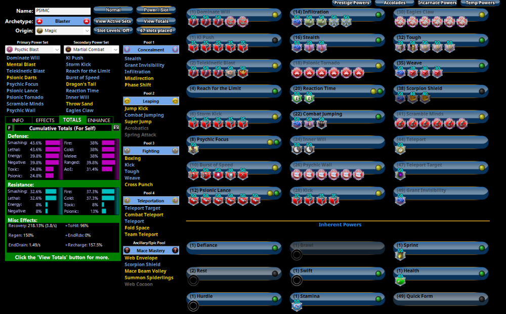 I have been having fun leveling up a Psy/Martial Combat Blaster recently and usually I just look for a build I like and copy/adjust off of what looks good to me. I have put something together based on a few other forum ideas and tips I had seen instead of going to sleep on time for work tomorrow. I am looking to have a Fringe-Combat into Melee playstyle and most of the power choices chosen I am relatively tied to. That said, I am open to suggestions, especially on the ancillary pool choices (I really like stealth for safely getting around and in for big Wails).