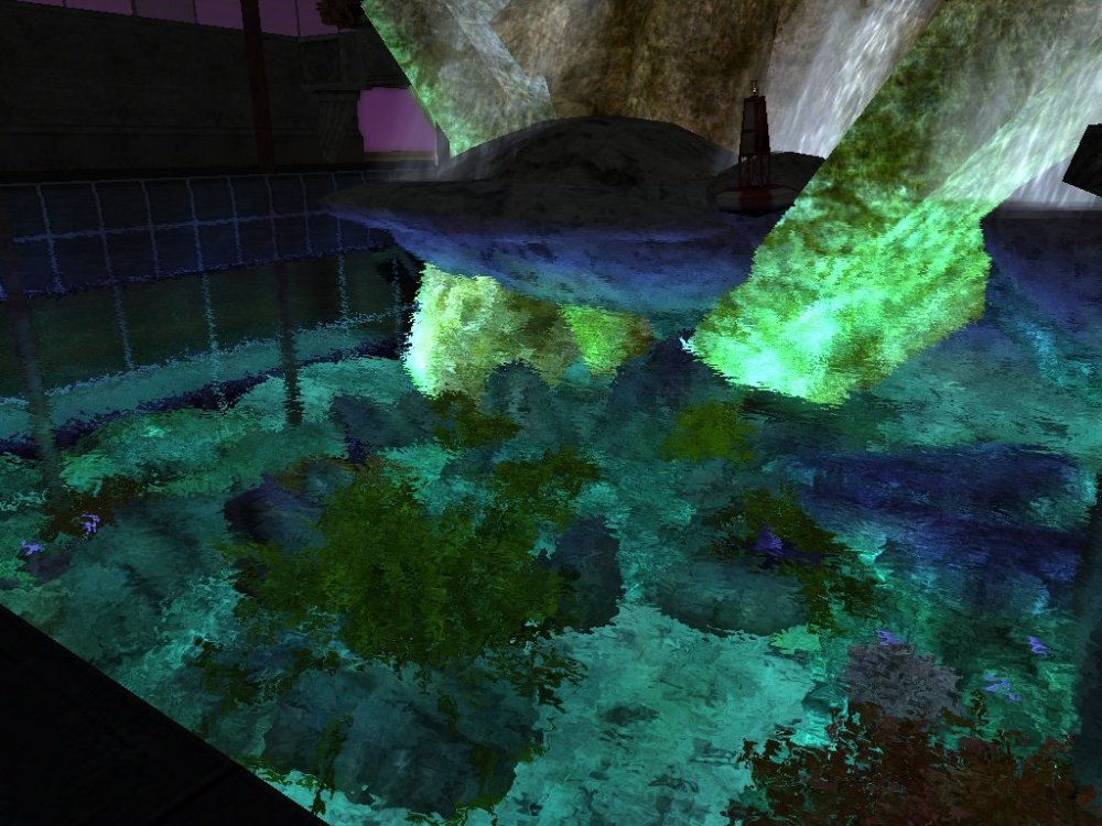 Hey, this is a month old but I had this same thing in my base and wanted to let you know how I figured it out. So instead of adding a floor on the top of a room, you'll want to add water slightly above the space in a room with the "open sky" feature. It should force the toon to look down into the water when they are swimming on the surface (but they cannot deep dive). I used Calm Water (Large) for mine. Other note: it can still look a bit glitchy if you don't zoom in all the way when swimming, but it works! View from the side: View from the top: Underwater views (not in edit mode):