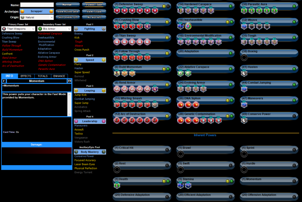 @BrandX & @Makobola Can you guys review this one please? I've been working on it for a few hours. @Makobola I took out Teleport and now I see why nobody has travel powers in their build... I also see your logic on the Defensive sweep, especially now that the powers recharge so fast. - Can you please look at this one? - Also I'm interested in seeing your +45% energy build too. - Also should I just take out Defensive Sweep and get the cookie cutter Moonbeam/Shadow Meld/_____ or what? This Hero build was built using Mids Reborn 3.2.17 https://github.com/LoadedCamel/MidsReborn Click this DataLink to open the build! Level 50 Natural Scrapper Primary Power Set: Titan Weapons Secondary Power Set: Bio Armor Power Pool: Fighting Power Pool: Speed Power Pool: Leaping Power Pool: Leadership Ancillary Pool: Body Mastery Hero Profile: Level 1: Defensive Sweep -- Obl-Acc/Dmg/Rchg(A), Obl-Acc/Dmg/EndRdx/Rchg(3), Obl-Dmg(3), Obl-Acc/Rchg(5), Obl-Dmg/Rchg(5), Obl-%Dam(27) Level 1: Crushing Blow -- KntCmb-Acc/Dmg(A), KntCmb-Dmg/EndRdx(7), KntCmb-Dmg/Rchg(7), KntCmb-Dmg/EndRdx/Rchg(9), AchHee-ResDeb%(9) Level 2: Titan Sweep -- SprAvl-Acc/Dmg(A), SprAvl-Dmg/EndRdx(11), SprAvl-Acc/Dmg/EndRdx(11), SprAvl-Acc/Dmg/Rchg(13), SprAvl-Rchg/KDProc(13) Level 4: Follow Through -- Hct-Dmg(A), Hct-Dmg/Rchg(19), Hct-Acc/Dmg/Rchg(21), Hct-Dmg/EndRdx(21), Hct-Dam%(25) Level 6: Build Momentum -- GssSynFr--Build%(A), RctRtc-ToHit/Rchg(23), RctRtc-ToHit(23) Level 8: Rend Armor -- SprBlsCol-Acc/Dmg(A), SprBlsCol-Dmg/EndRdx(15), SprBlsCol-Acc/Dmg/EndRdx(15), SprBlsCol-Acc/Dmg/Rchg(17), SprBlsCol-Dmg/EndRdx/Acc/Rchg(17), AchHee-ResDeb%(19) Level 10: Whirling Smash -- Arm-Dmg(A), Arm-Acc/Dmg/Rchg(29), Arm-Acc/Rchg(29), Arm-Dmg/EndRdx(31), Arm-Dam%(31), FrcFdb-Rechg%(31) Level 12: Arc of Destruction -- SprCrtStr-Acc/Dmg(A), SprCrtStr-Dmg/Rchg(33), SprCrtStr-Acc/Dmg/Rchg(33), SprCrtStr-Dmg/EndRdx/Rchg(33), SprCrtStr-Acc/Dmg/EndRdx/Rchg(34), SprCrtStr-Rchg/+50% Crit(34) Level 14: Hardened Carapace -- GldArm-3defTpProc(A), UnbGrd-ResDam(36), UnbGrd-Max HP%(34), UnbGrd-ResDam/EndRdx(36), UnbGrd-Rchg/ResDam(36) Level 16: Inexhaustible -- PrfShf-End%(A), HO:Golgi(27) Level 18: Environmental Modification -- Rct-Def(A), Rct-Def/EndRdx(39), Rct-EndRdx/Rchg(39), Rct-Def/Rchg(39), Rct-Def/EndRdx/Rchg(40), Rct-ResDam%(46) Level 20: Adaptation Level 22: Ablative Carapace -- Prv-Heal(A), Prv-EndRdx/Rchg(40) Level 24: Evolving Armor -- RctArm-ResDam(A), RctArm-ResDam/EndRdx(37), RctArm-ResDam/Rchg(37), RctArm-ResDam/EndRdx/Rchg(37) Level 26: DNA Siphon -- SprScrStr-Rchg/+Crit(A), SprScrStr-Dmg/Rchg(45), SprScrStr-Acc/Dmg/Rchg(45) Level 28: Genetic Contamination -- SprScrStr-Acc/Dmg(A), SprScrStr-Dmg/EndRdx/Rchg(40), SprScrStr-Acc/Dmg/EndRdx/Rchg(42), Erd-Acc/Dmg/EndRdx/Rchg(43), Erd-%Dam(45), Erd-Dmg(46) Level 30: Parasitic Aura -- Pnc-Heal/EndRedux(A), Pnc-EndRdx/Rchg(42), Pnc-Heal/Rchg(42), Pnc-Heal/EndRedux/Rchg(43), Pnc-Heal(43) Level 32: Weave -- LucoftheG-Def/Rchg+(A), ShlWal-Def(46), ShlWal-Def/EndRdx(48), ShlWal-ResDam/Re TP(48) Level 35: Tough -- StdPrt-ResDam/Def+(A), RctArm-ResDam(48), RctArm-ResDam/EndRdx(50), RctArm-ResDam/EndRdx/Rchg(50), RctArm-ResDam/Rchg(50) Level 38: Boxing -- Empty(A) Level 41: Hasten -- RechRdx-I(A) Level 44: Combat Jumping -- LucoftheG-Def/Rchg+(A) Level 47: Maneuvers -- LucoftheG-Def/Rchg+(A) Level 49: Conserve Power -- RechRdx-I(A) Level 1: Critical Hit Level 1: Brawl -- Empty(A) Level 1: Sprint -- Empty(A) Level 2: Rest -- Empty(A) Level 1: Swift -- Empty(A) Level 1: Hurdle -- Empty(A) Level 1: Health -- Pnc-Heal/+End(A) Level 1: Stamina -- PrfShf-End%(A), EndMod-I(25) Level 1: Momentum Level 20: Defensive Adaptation Level 20: Efficient Adaptation Level 20: Offensive Adaptation ------------