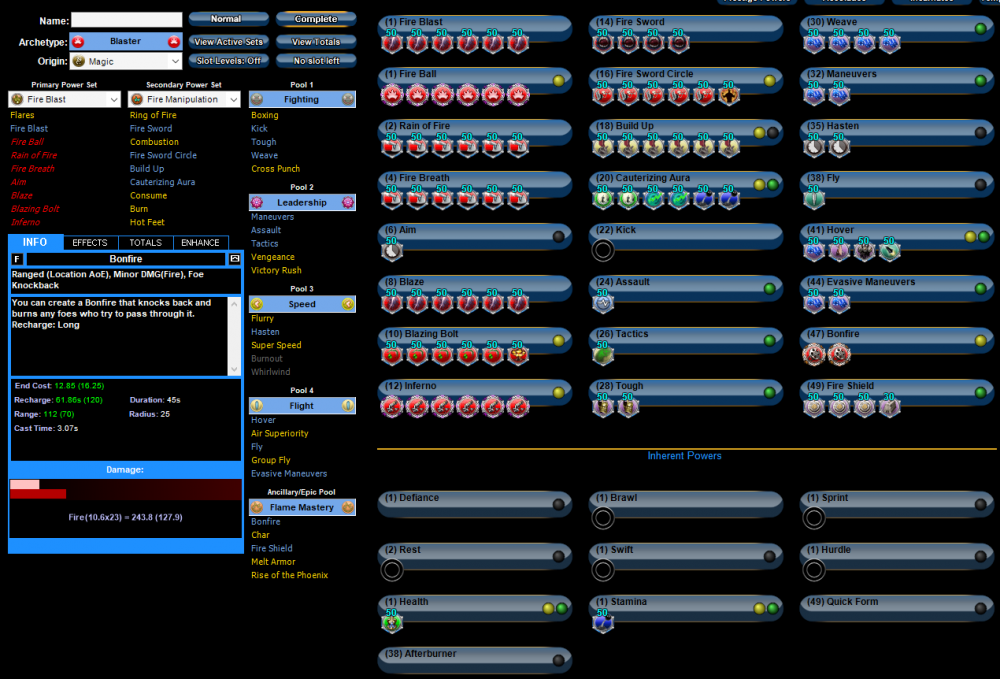 @Makobola Can you look at this one please (like comb over it and see if there's anything blatantly wrong)?: I copied a lot of what you had &: - Removed Burn (The 3% DMG lost from Obliteration set, I regained on Fire Sword via Makos Bite Set.) (The 9% accuracy lost from Obliteration set, I regained on Weave.) (I lost 2.25 resist on Smash/Lethal) - Removed Hot Feet (I really wont use these two because I'll be mostly flying for fun and I'll fly down every now and then to Fire Sword Circle + Inferno + Fire Sword, just for show offs/style points). That plus all of my other tools, I probably just wont use them. - Removed Combat Jumping & Superspeed (Went with Hover/Flight instead) - Added Flight / Hover / Evasive Maneuvers - Added Assault - Fire Sword instead of Ring of Fire - On Fire shield, I thought about trading Aegis for Reactive Armor (thoughts?) I really like Rise of the Phoenix but I couldn't fit it in there... Hover/Evasive Off: Hover/Evasive On: This Hero build was built using Mids Reborn 3.2.17 https://github.com/LoadedCamel/MidsReborn Click this DataLink to open the build! Level 50 Magic Blaster Primary Power Set: Fire Blast Secondary Power Set: Fire Manipulation Power Pool: Fighting Power Pool: Leadership Power Pool: Speed Power Pool: Flight Ancillary Pool: Flame Mastery Hero Profile: Level 1: Fire Blast -- Thn-Acc/Dmg(A), Thn-Dmg/EndRdx(3), Thn-Dmg/Rchg(3), Thn-Acc/Dmg/Rchg(5), Thn-Acc/Dmg/EndRdx(5), Thn-Dmg/EndRdx/Rchg(7) Level 1: Fire Ball -- SprBlsWrt-Acc/Dmg(A), SprBlsWrt-Dmg/Rchg(7), SprBlsWrt-Acc/Dmg/Rchg(9), SprBlsWrt-Acc/Dmg/EndRdx(9), SprBlsWrt-Acc/Dmg/EndRdx/Rchg(11), SprBlsWrt-Rchg/Dmg%(11) Level 2: Rain of Fire -- Artl-Acc/Dam(A), Artl-Dam/End(13), Artl-Dam/Rech(13), Artl-Acc/Dam/Rech(15), Artl-Acc/Rech/Rng(15), Artl-End/Rech/Rng(17) Level 4: Fire Breath -- Artl-Acc/Dam(A), Artl-Dam/End(17), Artl-Dam/Rech(19), Artl-Acc/Dam/Rech(19), Artl-Acc/Rech/Rng(21), Artl-End/Rech/Rng(21) Level 6: Aim -- RechRdx-I(A) Level 8: Blaze -- Thn-Acc/Dmg(A), Thn-Dmg/EndRdx(23), Thn-Dmg/Rchg(23), Thn-Acc/Dmg/Rchg(25), Thn-Acc/Dmg/EndRdx(25), Thn-Dmg/EndRdx/Rchg(27) Level 10: Blazing Bolt -- StnoftheM-Acc/Dmg(A), StnoftheM-Dmg/EndRdx(27), StnoftheM-Acc/ActRdx/Rng(29), StnoftheM-Dmg/ActRdx/Rchg(29), StnoftheM-Dam%(31), Apc-Dam%(31) Level 12: Inferno -- SprDfnBrr-Acc/Dmg(A), SprDfnBrr-Dmg/Rchg(31), SprDfnBrr-Acc/Dmg/Rchg(33), SprDfnBrr-Acc/Dmg/EndRdx(33), SprDfnBrr-Acc/Dmg/EndRdx/Rchg(33), SprDfnBrr-Rchg/+Status Protect(34) Level 14: Fire Sword -- Mk'Bit-Acc/Dmg(A), Mk'Bit-Dmg/EndRdx(34), Mk'Bit-Dmg/Rchg(34), Mk'Bit-Acc/Dmg/EndRdx/Rchg(36) Level 16: Fire Sword Circle -- Arm-Dmg/Rchg(A), Arm-Acc/Dmg/Rchg(36), Arm-Acc/Rchg(36), Arm-Dmg/EndRdx(37), Arm-Dam%(37), FuroftheG-ResDeb%(37) Level 18: Build Up -- GssSynFr--ToHit(A), GssSynFr--ToHit/Rchg(39), GssSynFr--ToHit/Rchg/EndRdx(39), GssSynFr--Rchg/EndRdx(39), GssSynFr--ToHit/EndRdx(40), GssSynFr--Build%(40) Level 20: Cauterizing Aura -- Prv-Absorb%(A), Prv-Heal(40), PwrTrns-EndMod(42), PwrTrns-+Heal(42), PrfShf-EndMod(42), PrfShf-End%(43) Level 22: Kick -- Empty(A) Level 24: Assault -- EndRdx-I(A) Level 26: Tactics -- AdjTrg-ToHit/EndRdx(A) Level 28: Tough -- GldArm-ResDam(A), GldArm-3defTpProc(43) Level 30: Weave -- LucoftheG-Def/Rchg+(A), LucoftheG-Def/EndRdx(43), LucoftheG-Def/EndRdx/Rchg(45), LucoftheG-Def(45) Level 32: Maneuvers -- LucoftheG-Def/Rchg+(A), LucoftheG-Def/EndRdx(45) Level 35: Hasten -- RechRdx-I(A), RechRdx-I(46) Level 38: Fly -- Flight-I(A) Level 41: Hover -- LucoftheG-Def/Rchg+(A), Rct-ResDam%(46), ShlWal-ResDam/Re TP(46), HypSnc-+Special(48) Level 44: Evasive Maneuvers -- LucoftheG-Def/Rchg+(A), LucoftheG-Def/EndRdx(48) Level 47: Bonfire -- OvrFrc-Dam/KB(A), OvrFrc-Dmg/End/Rech(48) Level 49: Fire Shield -- Ags-ResDam(A), Ags-ResDam/EndRdx(50), Ags-ResDam/Rchg(50), StdPrt-ResDam/Def+(50) Level 1: Defiance Level 1: Brawl -- Empty(A) Level 1: Sprint -- Empty(A) Level 2: Rest -- Empty(A) Level 1: Swift -- Empty(A) Level 1: Hurdle -- Empty(A) Level 1: Health -- Pnc-Heal/+End(A) Level 1: Stamina -- PrfShf-End%(A) Level 49: Quick Form Level 38: Afterburner ------------