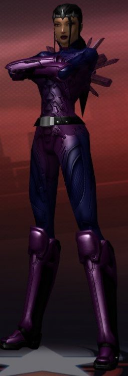 Up to this point, Tia had been one of your typical Paragon City residents, for whom muggings and purse-snatchings were an inevitability. One day, while walking to a bus stop after her office job, she caught a glimpse of a purplish-blue crystal in an alley. As she went to investigate it, some random Hellion grabbed her purse and pushed her down. Tia fell back, and that crystal she had spotted earlier became imbedded in her back. Feeling a surge of power that she'd never experienced before, she struck out at her attacker, quickly defeating him and recovering her purse, before running home as quickly as she could. After a feverish night, the Kheldian that was in that crystal revealed itself to her, explaining its origins and how the two of them had now become one. Thus, Tia began a life of heroism, naming herself after the purple-blue crystal that started it all... tanzanite tia2.costume