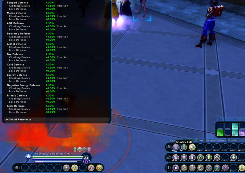 While turned on, it gives me no defense according to the attributes window. It doesn't even show up. EDIT: It seems cloaking device overrides shadow fall instead of adding it's defense. If I turn off cloaking device, shadow fall pops up.