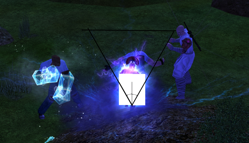 I'm afraid, It is not plenty. Grab some mobs around you, the side mobs are at a 90 degrees angle from you. 70 degrees, is only 35 on each side of the mob you're attacking, keeping in mind that being a cone, the closer they are, the wider the angle needs to be to hit them. I've just checked, and my power still says 50 degrees, despite gauntlet being on, but even if it is, it would not be enough regardless. Sure, theme is fine, but the power, is virtually useless. It's a game about super heroes, it's not meant to be realistic 🙂 Hell, if that's all it takes, rename the power arc lightening or whatever. ^_^ Please excuse the poor quality of the example, but I've only got paint on this machine, but here's roughly what the hit area for 7ft with a 70 degree angle is like in the game: I'm hoping that once it's more visual, the issue would be more obvious. Remember that 70 degrees, only means 35 on each side of the targeted mob, minus the actual hit box of the mob with its collision area as well, with only 2 meters at the back (also with the mob's space and its collision space) , it really is not a lot I'm afraid 😞 I'm not even sure a 90 degree angle would make a big difference. It probably would add 2 mobs or so if they're at the back, maybe. Now, consider the power's restriction '10 mobs max', to me it is clear it was thought of as an actual AOE kind of power, because there's simply no way you could get 10 mobs in such a small area, 4 at most if they literally walk/fly on each other. I'll repeat it once more, cone powers, are simply not fit for melee attacks, it makes no sense whatsoever. Cones, needs both angle and a reasonable distance to be of any use, otherwise, you're literally farting in the air.