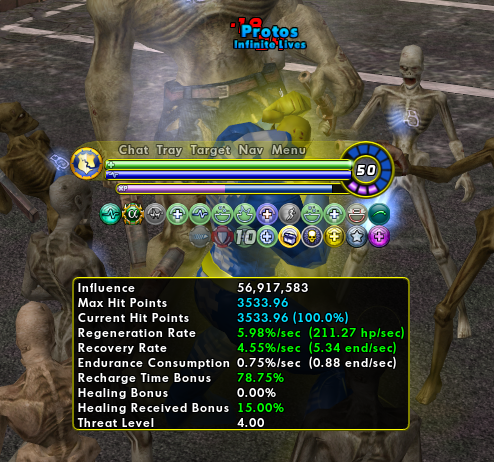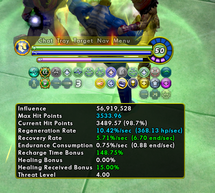 Tanker (Regeneration - Radiation Melee).mbd That is close to what I have in game. Note the Mids build doesn't accurately account for a number of things (Reactive Regeneration bonuses or the debuff resistances for example). In fact, I've had a lot of trouble with Mids lately and just stopped trying to manually update/redownload everything. I went with Radiation Melee as my secondary powerset because it has an additional AoE aura toggle, (Integration is the primary Taunt aura for Tankers) and was on theme for my character. I also took Energy Mastery -> Energy Torrent to use the alternate animation with laser beam that arcs across because it looks cool. The point of me mentioning that is there is plenty of room to improve on other things to make the build how you want it. I found building too much Defense caused Reactive Regeneration to not reach max stacks (10), so building for MaxHP and as high resistance numbers as you can get help more. If I could recommend one thing for the Tanker version of Regeneration, it would be that having an Absorb shield added on to cushion the alpha would be helpful. Regeneration lives on the edge and requires a focused play style to react to incoming damage - gone are the days of afking around a dozen monsters in the Hive and coming back later to find yourself alive and well.