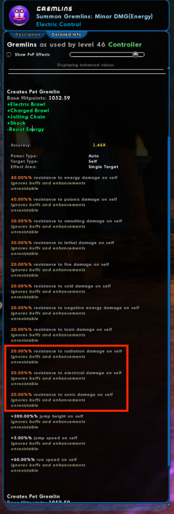 Hey everyone. I'm not entirely sure where to post this so i'll post it here. So I'm leveling up an Electric/TA which I'm loving the changes to the powerset. Being able to control Gremlins is an absolute game changer. I didn't play on beta but I did see the patch notes and did not see anyone mention what i'm about to show you. I looked at Gremlins description and saw that their resistances got updated. ...including 3 damage types that aren't in the game...: Radiation, electrical, and sonic resistance? Even on cod.uberguy these resistances are shown: https://cod.uberguy.net/html/power.html?power=pets.gremlin.resist_energy&at=minion_controllerpets So whats going on here? Any clarification would be appreciated.