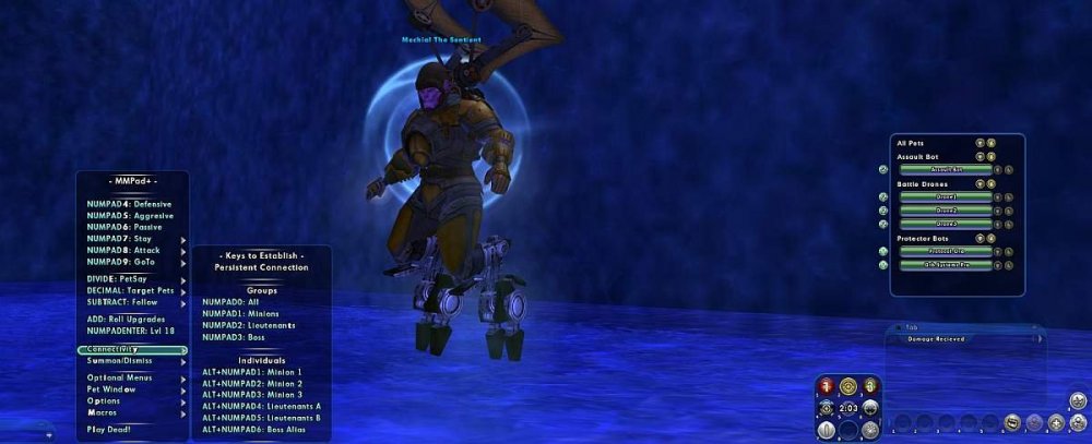 MMPad+Bots * Not tested by qwy QuickLinks Top | Beasts | Bots | Demons | Mercs | Necro | Ninjas | Thugs 1. Preamble The attached download is primary specific and includes all the support docs not listed on this post. The other primaries binds, their menu commands and load options have been removed to minimize the clutter. 2. Default File @/!/MM/Bots/Pad.txt No editing required. 3. Group Files Assault.txt | Protectors.txt | Drones.txt With exception of the command to target the boss pet, no editing necessary. See section 2.B of the top post. 4. Pet Files ProtectorA.txt | ProtectorB.txt | Drone1.txt | Drone2.txt | Drone3.txt These files need to link to individual pets. See section 2.C in the top post. 5. Rolling Bind Files 1up.txt | 2up.txt See the top posts section 3 and the support docs, for more information. 6. Support Docs LoadBots.txt This is a primary specific version of the LoadMMPad+.txt file. There are no in-game functions but there are command options for loading the bind set to a logged in character. The attached .rar includes this version of the load commands and the full ReadMe, Install and Help.txt from above. 7. Optional Menus Bots+.window | Bots+.mnu This version of the window and menu are primary specific. If you're interested in more than one primary, I'd recommending using the version in the top posts section 5 or the top posts .rar file. 8. Downloads MMPad+Bots.rar The download in this post is primary specific. If you're interested in additional primaries, I recommend the top post download. tested MMPad+Botsv200703.rar