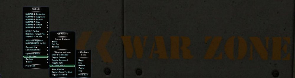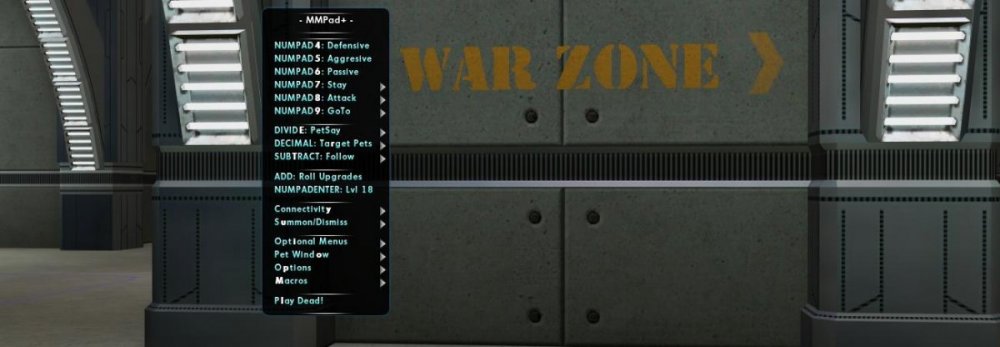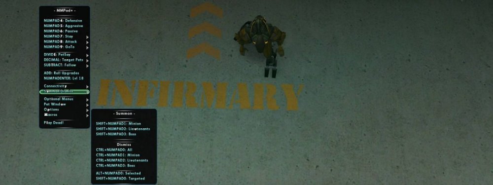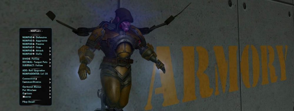i26 Mastermind NumPad Controls+ MMPad+ by qwy QuickLinks Top | Beasts | Bots | Demons | Mercs | Necro | Ninjas | Thugs Preamble: I've only rolled one MM since coming back, Bots. It's fair to say, I might not have rolled an MM at all, if I hadn't seen the original Numpad Controls posted on the Homecoming forum. I had forgotten all about how much fun Masterminds are with them. Before I got out of Outbreak, the Sandolphan's original binds were installed and I was fully reacquainted. So fun! As I leveled up, I kept adding to it every time a new idea came to mind. This version represents my, most sincere, first step from the original. I'm trying to stick to the simple elegance of the original, scaling back some of the far off, or clunky additions for another time. What's new: Not straying too far from the original, here are the key additions; An easy selection method for controlling individual pets Can target a specific pet, cycle through a group of pets or cycle through all of them Added "Petsay" to the selection method Trigger both upgrades in 1 click. - only bots have been tested Follow modes, have been moved to SUBTRACT, for easy slap panic All commands can now change the selected pet/group strance, i.e. defensive follow, passive stay, aggresive attack Dismiss added to select method Added popmenu with some basic commands, control options of the pet window, generate a variety macros and a bind cheat sheet. Added a custom.window to load the file and generate macros with icons consistent with the primary to summon and load numpad controls. What's different: It should look pretty familiar, right out of the box. A few key difference; The All.txt file has been replaced with Pad.txt and, is specific to each primary . There are now, (11) files per primary. (5) for individual control of each minion and lieutenant. Additional editing required. (2) for the toggle upgrades to occur in a single click. (1) Pad.txt, this versions, "All.txt" (3) One for each tier group Disclaimer The folder hierarchy mirrors my own. It's stored in the Installations data folder and has, what may appear to be, superfurlous sub folders. This is in anticipation of additional bind sets, I'm planning on sharing in the near future. Editing paths and file names, to suit your needs, shouldn't be an issue. with exception to the custom.window and Popmenu paths, which are required by the interface. Help Me / Help You If there are any questions, please don't hesitate to ask. If any files were edited as part of your installation, please describe the new variables on any requests for assistance. Not having rolled other primaries, any help testing and correcting mistakes I might have made, would be very much appreciated. 1. Binds according to selected pets: 1.A Base Binds NUMPAD0: Select All Key No Chord +ALT +SHIFT +CTRL Defensive Key Aggressive Key Passive Key NUMLOCK: - - - - DIVIDE: all pet say all minions Say all lieutenants say boss says MULTIPLY: open popmenu toggle custom.window SUBTRACT: all follow all def follow all agg follow all pas follow NUMPAD9: all go to all def got all agg got all pas got NUMPAD8: all attack target all def att target all agg att target all pas att target NUMPAD7: all stay all def stay all agg stay all pas stay NUMPAD6: all passive select boss alias NUMPAD5: all aggressive select lieutenant B NUMPAD4: all defense select lieutenant A NUMPAD3: select boss select minion 3 summon boss dismiss boss NUMPAD2: select lieutenants select minion 2 summon lieutenants dismiss lieutenants NUMPAD1: select minions select minion 1 summon minions dismiss minions NUMPAD0: select all nop dismiss target dismiss all ADD: roll upgrades #PADENTER: pet heal targeted DECIMAL: cycle target next pet all cycle target next minions cycle target next lieutenants target boss 1.B Group Binds NUMPAD1-3: Select Group Key No Chord +ALT +SHIFT +CTRL Defensive Key Aggressive Key Passive Key NUMLOCK: - - - - DIVIDE: selected group say all minions say all lieutenants say boss says MULTIPLY: open MMPad+ popmenu toggle MMPad+ custom.window SUBTRACT: selected group follow selected group def fol selected group agg fol selected group pas fol NUMPAD9: selected group go to selected group def got selected group agg got selected pas got NUMPAD8: selected group attack target selected group def att target selected group agg att target selected group pas att target NUMPAD7: selected group stay selected group def sta selected group agg sta selected group pas sta NUMPAD6: selected group passive select boss alias NUMPAD5: selected group aggressive select lieutenant B NUMPAD4: selected group defense select lieutenant A NUMPAD3: select boss select minion 3 summon boss dismiss boss NUMPAD2: select lieutenants select minion 2 summon lieutenants dismiss lieutenants NUMPAD1: select minions select minion 1 summon minions dismiss minions NUMPAD0: select all nop dismiss targeted pet dismiss all ADD: roll upgrades, all #PADENTER: pet heal targeted DECIMAL: Selected group target next pet cycle target next minions cycle target next lieutenants target boss 1.C Individual Binds ALT+NUMPAD1-6: Select Pet Key No Chord +ALT +SHIFT +CTRL Defensive Key Aggressive Key Passive Key NUMLOCK: - - - -- DIVIDE: selected pet say all minions say all lieutenants say boss says MULTIPLY: open MMPad+ popmenu toggle MMPad+ custom.window SUBTRACT: selected pet follow selected pet def fol selected pet agg fol selected pet pas fol NUMPAD9: selected pet go to selected pet def got selected pet agg got selected pet pas got NUMPAD8: selected pet attack target selected pet def att target selected pet agg att target selected pet pas att target NUMPAD7: selected pet stay selected pet def sta selected pet agg sta selected pet pas sta NUMPAD6: selected pet passive select boss alias NUIMPAD5: selected pet aggressive select lieutenant B NUIMPAD4: selected pet defense select lieutenant A NUMPAD3: select boss select minion 3 summon boss dismiss boss NUMPAD2: select lieutenants select minion 2 summon lieuten