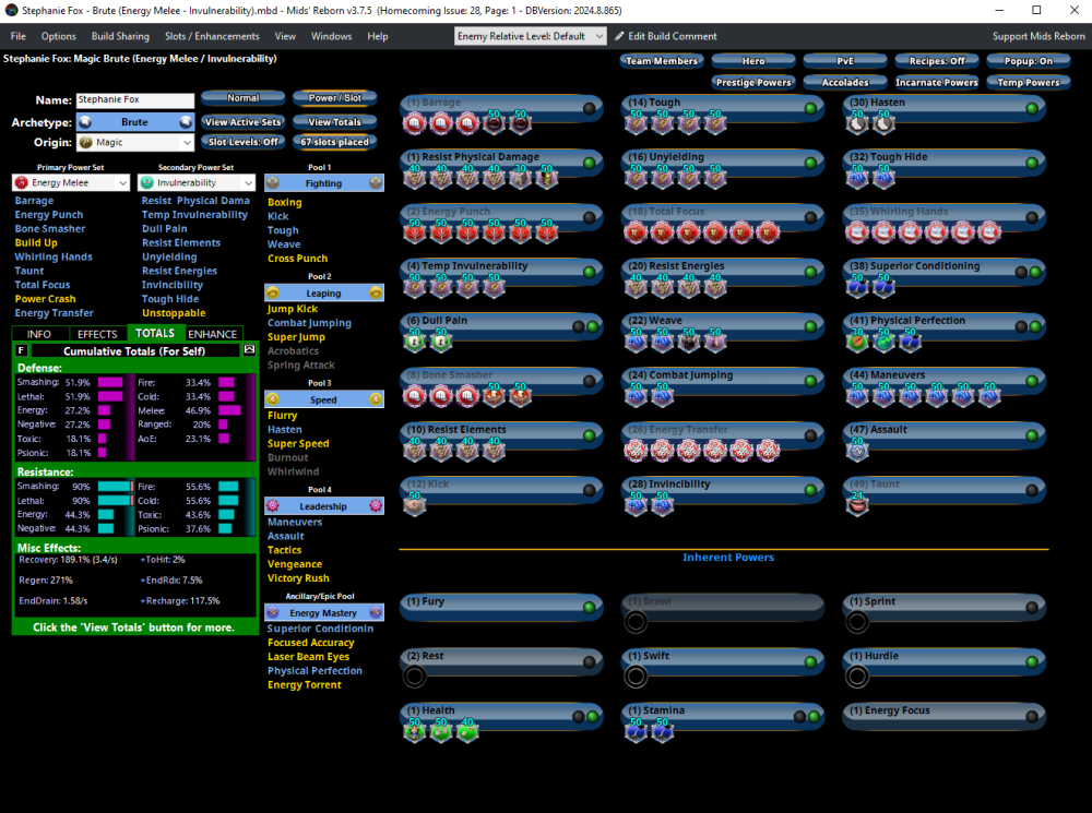 1. Greetings all. I would like your overall thought, comments and suggestions on my build. Photo attached showing totals. Below is power and slotting breakdown. Build was obviously inspired by Hyperstrike's template 🙂 Level 1: Barrage SprBrtFur-Acc/Dmg/Rchg:50(A), SprBrtFur-Dmg/EndRdx/Rchg:50(43)... ...SprBrtFur-Acc/Dmg/EndRdx/Rchg:50(45), Mk'Bit-Acc/Dmg:50(45), Mk'Bit-Dam%:50(45) Level 1: Resist Physical Damage RctArm-ResDam:40(A), RctArm-ResDam/EndRdx:40(3), RctArm-ResDam/Rchg:40(3)... ...RctArm-ResDam/EndRdx/Rchg:40(5), StdPrt-ResDam/Def+:30(5), GldArm-3defTpProc:50(7) Level 2: Energy Punch Hct-Dmg:50(A), Hct-Dmg/Rchg:50(31), Hct-Acc/Dmg/Rchg:50(31)... ...Hct-Acc/Rchg:50(31), Hct-Dmg/EndRdx:50(46), Hct-Dam%:50(50) Level 4: Temp Invulnerability UnbGrd-ResDam:50(A), UnbGrd-ResDam/EndRdx:50(7)... ...UnbGrd-Rchg/ResDam:50(9), UnbGrd-ResDam/EndRdx/Rchg:50(9) Level 6: Dull Pain Prv-Heal/Rchg:50(A), Prv-Absorb%:50(34) Level 8: Bone Smasher SprBrtFur-Acc/Dmg:50(A), SprBrtFur-Dmg/Rchg:50(33)... ...SprBrtFur-Rech/Fury%:50(33), CrsImp-Acc/Dmg/Rchg:50(34), CrsImp-Acc/Dmg/EndRdx:50(34) Level 10: Resist Elements RctArm-ResDam:40(A), RctArm-ResDam/EndRdx:40(11)... ...RctArm-ResDam/Rchg:40(11), RctArm-ResDam/EndRdx/Rchg:40(13) Level 12: Kick FrcFdb-Rechg%:50(A) Level 14: Tough UnbGrd-ResDam:50(A), UnbGrd-ResDam/EndRdx:50(15)... ...UnbGrd-Rchg/ResDam:50(15), UnbGrd-ResDam/EndRdx/Rchg:50(17) Level 16: Unyielding UnbGrd-ResDam:50(A), UnbGrd-ResDam/EndRdx:50(17)... ...UnbGrd-Rchg/ResDam:50(19), UnbGrd-ResDam/EndRdx/Rchg:50(19) Level 18: Total Focus SprUnrFur-Acc/Dmg:50(A), SprUnrFur-Dmg/Rchg:50(39), SprUnrFur-Acc/Dmg/Rchg:50(39)... ...SprUnrFur-Dmg/EndRdx/Rchg:50(39), SprUnrFur-Acc/Dmg/EndRdx/Rchg:50(40), SprUnrFur-Rchg/+Regen/+End:50(40) Level 20: Resist Energies RctArm-ResDam:40(A), RctArm-ResDam/EndRdx:40(21)... ...RctArm-ResDam/Rchg:40(21), RctArm-ResDam/EndRdx/Rchg:40(23) Level 22: Weave LucoftheG-Def/Rchg+:50(A), LucoftheG-Def:50(23)... ...ShlWal-ResDam/Re TP:50(25), Rct-ResDam%:50(25) Level 24: Combat Jumping LucoftheG-Def/Rchg+:50(A), LucoftheG-Def:50(27) Level 26: Energy Transfer SprBlsCol-Acc/Dmg:50(A), SprBlsCol-Dmg/EndRdx:50(40), SprBlsCol-Acc/Dmg/EndRdx:50(42)... ...SprBlsCol-Acc/Dmg/Rchg:50(42), SprBlsCol-Dmg/EndRdx/Acc/Rchg:50(42), SprBlsCol-Rchg/HoldProc:50(43) Level 28: Invincibility LucoftheG-Def/Rchg+:50(A), LucoftheG-Def:50(29) Level 30: Hasten RechRdx-I:50(A), RechRdx-I:50(36) Level 32: Tough Hide LucoftheG-Def/Rchg+:50(A), LucoftheG-Def:50(33) Level 35: Whirling Hands SprAvl-Acc/Dmg:50(A), SprAvl-Dmg/EndRdx:50(36), SprAvl-Acc/Dmg/EndRdx:50(36)... ...SprAvl-Acc/Dmg/Rchg:50(37), SprAvl-Acc/Dmg/EndRdx/Rchg:50(37), SprAvl-Rchg/KDProc:50(37) Level 38: Superior Conditioning PrfShf-EndMod:50(A), PrfShf-End%:50(50) Level 41: Physical Perfection RgnTss-Regen+:30(A), PwrTrns-+Heal:50(43), PrfShf-End%:50(50) Level 44: Maneuvers LucoftheG-Def/EndRdx:50(A), LucoftheG-Def/Rchg:50(46), LucoftheG-EndRdx/Rchg:50(46)... ...LucoftheG-Def/EndRdx/Rchg:50(48), LucoftheG-Def:50(48), LucoftheG-Def/Rchg+:50(48) Level 47: Assault EndRdx-I:50(A) Level 49: Taunt PrfZng-Dam%:21(A) ------------ Level 1: Fury Level 1: Brawl Empty(A) Level 1: Sprint Empty(A) Level 2: Rest Empty(A) Level 1: Swift Empty(A) Level 1: Hurdle Empty(A) Level 1: Health Pnc-Heal/+End:50(A), NmnCnv-Regen/Rcvry+:50(13), Mrc-Rcvry+:40(27) Level 1: Stamina PrfShf-End%:50(A), PrfShf-EndMod:50(29) Level 1: Energy Focus