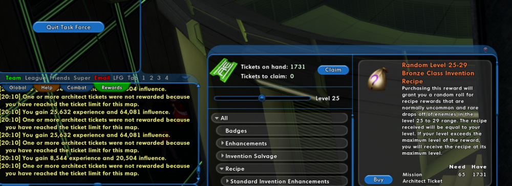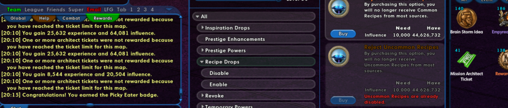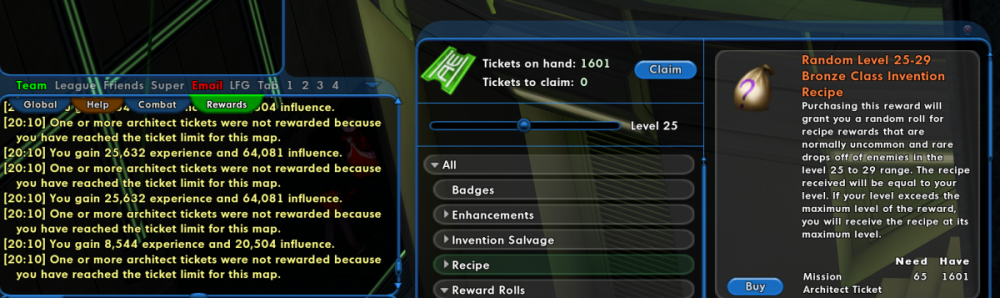 25. Recently I attempted to claim several rewards very quicky, basically just spamming "buy". When I went to look at what enhancements I had been awarded, to my surprise I could only find 2 recipies. Double checked my rewards tab, and it confirmed, I claimed 1500 tickets worth of bronze rewards and only got 2 tickets. Went and farmed some more to try to reproduce, and it happened on my very first claim -- went ahead and spent the rest of my tickets to see how many I would get. Tested it some more and realized it was actually due to the "Reject Uncommon Recipies" setting. I did not test with inspirations, but may also have similar effects. Uncertain if this is a Bug or working as intended*, but Perhaps there should be a warning on the vendor? I completely forgot I had this set, as I am bad at inventory management and don't usually look at it unless I'm ready to vendor or Market. I have mixed feelings about this. On the one hand I understand why it likely works this way. On the other hand, for me personally the reason I deny the uncommons is because at level 50 they're mainly just a pain to deal with, and they fill my inventory too quickly during regular play. Alternatively from a vendor when that's actually what I'm attempting to do and I can select the level range I want it's a bit annoying for them to "poof". *Realistically I think it is a bit of both -- technically probably working as intended, but an edge case over sight.