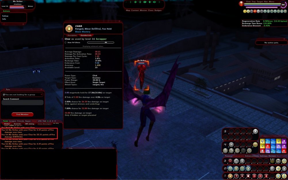 Scrapper's version of Char from the Blaze Mastery ancillary pool has some strange crit damage shenanigans. Against minion and underling mobs the critical damage appears normal, double the damage of the DoT as expected. Against Lts and Bosses however the critical damage seems to be multiplied several times. Against a Mu Striker, it dealt 22 damage with the critical alone (Mu have some fire resistance, but the math still checks out). Against a Crab Spider Webmaster the critical damage was a whopping 191, even though it should've only been around 25-28. The damage numbers in my screenshots are a bit higher, I have a +10% damage buff from enhancements, but no secondary effects were applied to the test targets. Here's the Mu Striker hit And here's the Crab Spider hit Also, shoutout to the guy in chat who chastised me for considering reporting a damage bug.