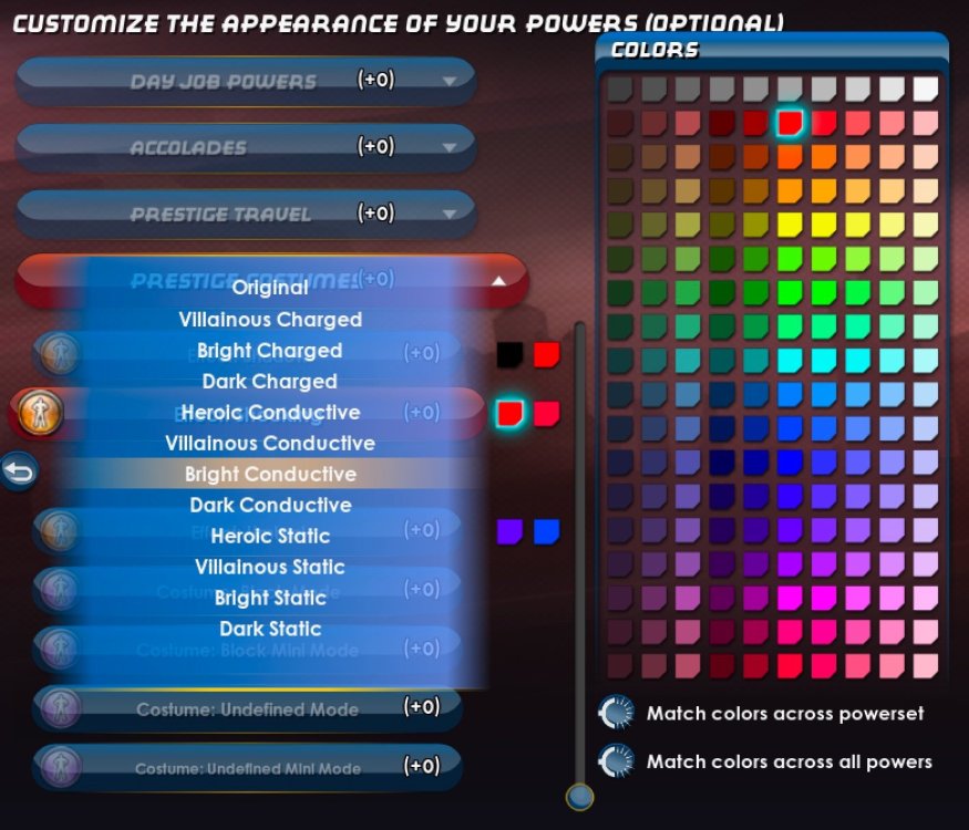 Here is the complete list of your options. So yes, some are only color customizable I guess. Effect: Chill Original Color Tintable Minimal FX Effect: Darkness Original Color Tintable No Fade Or Pulse Soul Noir Soul Noir With Eyes Murky Cloud Murky Cloud Tintable Cloak Of Fear Cloak Of Fear Tintable Effect: Drone Original Color Tintable Effect: Earthen Original Color Tintable Lava Crystal Color Tintable Minimal Lava Minimal Crystal Minimal Effect: Entropic Original Bright Energy Dark Energy Energy Glow Effect: Flames Original Bright Fire Dark Fire Original Flames Bright Flames Dark Flames Effect: Ghost Original Color Tintable Minimal FX Effect: Luminous Original Color Tintable Color Tintable With No Bubble Eye Aura Eye Aura Tintable Effect: Organic Original Color Tintable Effect: Photosynthesis Original Color Tintable Overgrowth Original Overgrowth Tintable All Original All Tintable Effect: Psionic Original Bright Dark Effect: Puncture Original Color Tintable Thorns Metal Spikes Crystalline Spines Slate Spines Effect: Reflection Original Color Tintable Minimal FX Effect: Shadow Original Color Tintable Minimal FX Effect: Shocking Original Villainous Charged Bright Charged Dark Charged Heroic Conductive Villainous Conductive Bright Conductive Dark Conductive Heroic Static Villainous Static Bright Static Dark Static Effect: Umbral Original Color Tintable Color Tintable With No Bubble Eye Aura Eye Aura Tintable