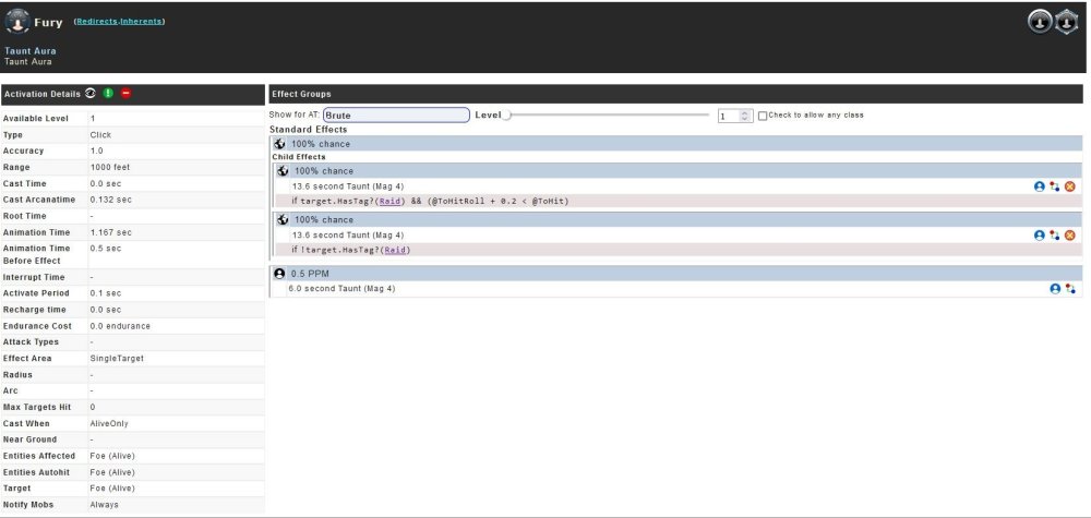 Yeah, if the issue that would prevent the OP from being implemented is that the devs don't want to increase taunt effects for just Scrappers, then it is a non-issue. Tanker Willpower: 100% chance 1.25 second Taunt (Mag 3) if target.HasTag?(Raid) && (@ToHitRoll + 0.2 < @ToHit) The issue isn't Scrapper versus Tanker. The issue is there are apparently two sets that have no mentionable taunt in their aura taunt effects. My /Willpower brutes have no mob holding ability. I didn't even know RttC even had a taunt component. So I agree with the OP. RttC and Entropic Aura should have their durations upped to the 13.6 seconds every other set has. -