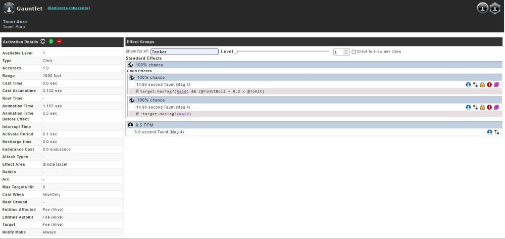 Gauntlet also has the raid tag. Standard Effects 100% chance Child Effects 100% chance 14.96 second Taunt (Mag 4) if target.HasTag?(Raid) && (@ToHitRoll + 0.2 < @ToHit) 100% chance 14.96 second Taunt (Mag 4) if !target.HasTag?(Raid) 0.5 PPM 6.0 second Taunt (Mag 4) Edit: And is single target only. So how does that work for an 8-feet radius aura? Best you can claim is a 6 second taunt. -