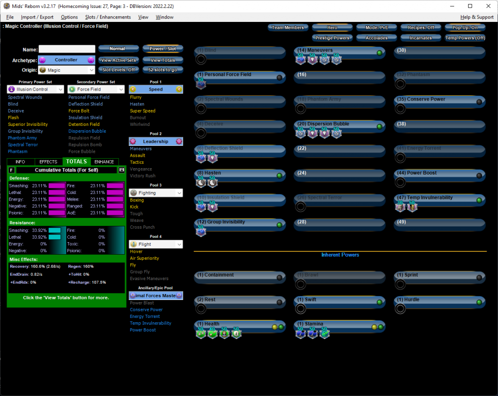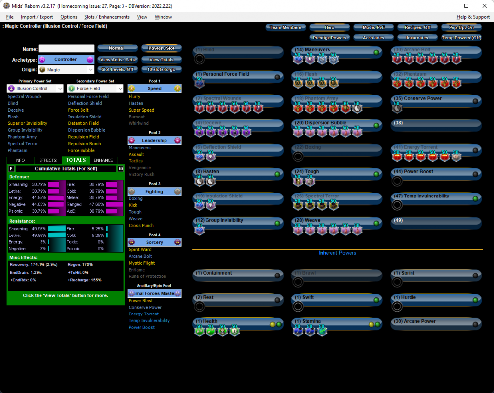 Since you are so new, I don't what to overwhelm you with a complete build. I've provided a "training build" below that will hopefully highlight some key things I'd personally chase if I were making this character. The main synergy between Force Field and Illusion is plenty of places to slot Luck of the Gambler +Recharge IOs. These cost about 6 million each. Each will grant you +7.5% global recharge for each one you slot. You can slot up to five of these in your build. Force Field will provide you some personal Defense, but no healing or Resistance. You can help cover some of this by grabbing IOs to place in Health and Stamina. These will also help with Endurance costs. You're probably going to want at least one Resistance power, both for the Resistance itself, but also so you can slot Steadfast Protection and Gladiator's Armor +3% Defense procs. For your epic power pool, if you're playing Force Field, I usually recommend the Primal Pool, for Power Boost. Power Boost will double the strength of your shields when you cast them, making your contribution to the team twice as good as normal. It's a must take for me as a Force Fielder. You can choose between Group or Superior Invisibility. I'd personally take Group Invisibility to boost your teammate's Defense that little bit extra. I believe you can also Power Boost this, but it's not a lot of Defense. It will make them invisible until attacked, though. You have plenty of power slots left over. You can take any of the powers you want from what's available or in pools. I left these blank so you could see the stuff that I'd flag as typical of this type of build more easily. The build: For a build that's a bit further along, here's a mid-way build where we've gotten Ranged defense to the soft cap, and the recharge on Phantom Army down to just a 6 second or so gap. There's a proc in Energy Torrent that provides +recharge when you hit a lot of enemies that brings this down a bit more if you're spamming that power a lot. Again, neither of these builds are meant to imply you don't slot your other stuff, they're just showing the key powers and how you could structure your approach.