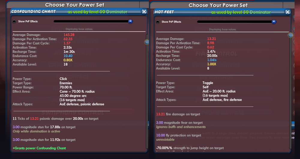 I want to expand a bit on the theme above about the stun cone ("Confounding Chant") and why I keep comparing it to a Hot Feet. Here's the two powers side by side at Level 50: Confounding Chant delivers 11 ticks of damage over a 20 second duration. This breaks down to one tick every ~2 seconds. It just so happens that Hot Feet pulses at a rate of 1 tick every 2 seconds, so these powers do more or less identical damage. Hitting an enemy with Confounding Chant is equivalent-ish to them standing in your Hot Feet for an equal duration. There's a bit more to this though, and this is why this powerset is so different from the existing sets. Confounding Chant follows rules that might be better thought of as a nuke. That's because Hot Feet recalculates its damage every tick, where Confounding Chant is front loaded. You want to hit every +Damage Strength ability you have prior to launching it, because that way you get 11 ticks of very high damage. So, if you have Build Up (+42% damage) and a Gaussian's proc (+68% damage) you'll deal +110% damage with your Chant. Hot Feet would only get the +Damage effect for half of those ticks. With 90 recharge, 20 duration, it's not possible to double stack the DoTs. (An earlier version of the power had 30 second duration, and it was possible.) You can still get pretty close to perma up-time though. 90 recharge at the absolute recharge limit recharges in 22 seconds. More realistically, end game builds probably have this power at around a 28 second recharge, which means 8 seconds of downtime. Not a huge loss IMO--Hot Feet can technically outplay you because it is always available, but Confounding Chant comes with the addendum that you can move or hover away and that damage keeps going, where with Hot Feet you're only getting that damage while you maintain close range. -