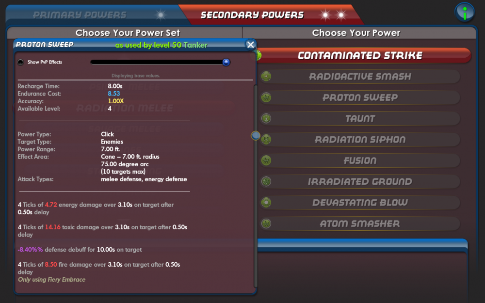 Proton Sweep's in-game info window damage numbers appear to be including the Fiery Embrace damage in the totals. That makes it look like the power is significantly stronger than it really is. Add up the numbers in the screenshots and you'll see that the Firey Embrace damage is being added in, when other powers don't do that.