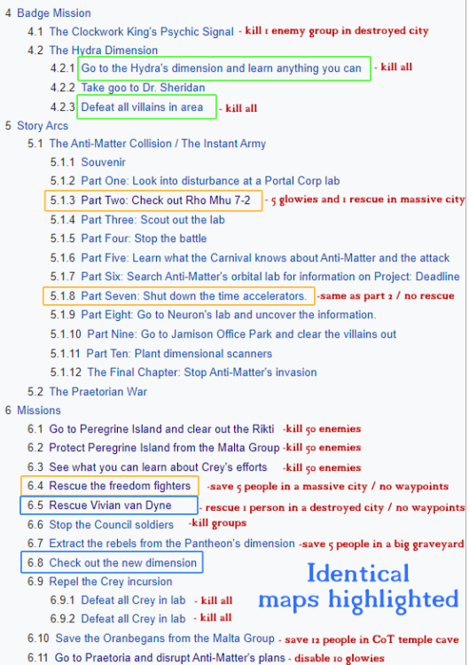 So, I just recently played through basically all of Tina Macintyre's updated post-GR missions (Peregrine Island/Portal Corps) and found the map and objective choices in many of them to be incredibly redundant and in need of a little bit of TLC. Not to mention she has a *lot* of missions with missed potential. And I mean, like, a *lot* of missions: Arc missions Part 2, Part 7, and the non-arc mission "Rescue the Freedom Fighters all use the same overly-large outdoor Paragon map with almost no way to find the objectives other than combing the map grid-by-grid and destroying every single enemy until you can find the tiny corner where the captive NPCs or glowies are tucked away. There isn't any unique dialogue tied to approaching them to let the player know they're close either. Most of her random missions suffer from being in a massive open-world map with one tiny glowy to find, one-to-five NPCs to fnd, or one-to-five NPCs to kill, many with time limits. They're all mostly an exercise in patience than anything else. Additionally, one of her randoms, "Disrupt Anti-Matter's Plans" is basically incongruent with the plot of her story arc, as it's dealing with the same thing, but worse, and if you do it post-story arc, it feels like Anti-Matter, Tina, *and* the player have all suffered a bout of amnesia and forget everything about it. In the end, the non-arc missions end up feeling like (or outright being) filler, and while the arc itself contains a bit of filler as a treat, it kinda feels like a huge missed opportunity? For a lot of players, these will be their first looks into the alternate universes that make up the CoH setting (Praetoria notwithstanding). Nearly all of the visits to the other universes are superficial at most, and it's similar to looking out onto a vast lake, only to find that it's ankle deep and you're expected to find 5 shiny rocks and a white crab somewhere under the surface of it without a hint as to where. The Hydra mission, despite its 'kill all' condition, is the best use of these worlds without a full accompanying story arc. We pop in, get some lore, pop back, report it and take it for analysis, then pop back over for some follow-up lore and the mission map isn't 30 square miles wide. I can't help but wonder if it might even be useful to move a few of these over to Talos Island with the Rift Enclosure and a new contact who is doing a little bit of *off the books* research to fill in some lower level story content. There's so much potential here and it's being wasted on filler missions that serve to let you glance at these lore rich areas but not really touch them.