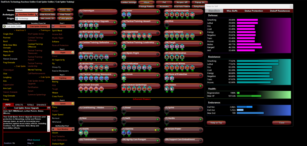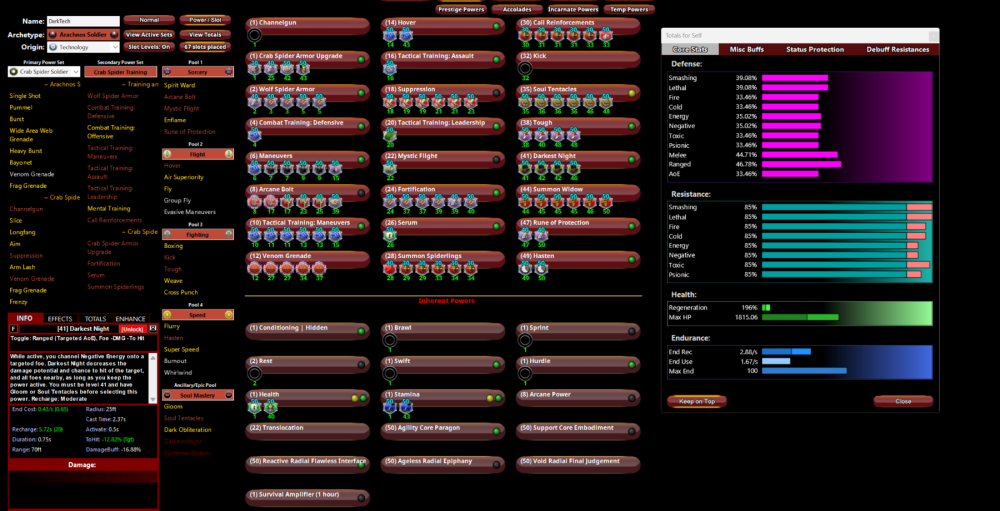 @Scarlet Shocker - I have a suggestion that nobody has mentioned yet - SoA, specifically, a crabber. I see them as sort of the hidden "Battle Mage" of the game. Its fairly easy to hit your DEF softcaps, and their resists can get as high as 85%. You can have an all-ranged build, even with flying. The only CC to speak of is web grenade or patron pool stuff, but often Hover proves to be enough. You can just hover, throw web grenade, follow up with venom grenade, frag, suppression, etc. Your full attack chain can be ranged. And your AoE is actually very good. Your ST isn't so good though. You can boost it with things like Arcane Bolt, Gloom, Spirit Shark etc, but even then it's pretty "blah." Only with the pets all dogpiling things can you do good ST dps, but the problem is (when solo) you have limited tools to keep them alive. Even if you built to make them as durable as possible, on anything harder than +3/8 they are going to die often. Most of the time they shoot a few times, and then run in, and get clobbered. On teams its quite good since the pressure isn't ALL on them, but alone your choices really are play on lower difficulties than +4/8, or accept they are entirely disposable and will die often. The other Crabby issue is they are fairly harsh on the blue bar. Not as bad as Dark Armor is, but its rougher than most. The way I see it, you can build them two general ways - 1. Focus on Recharge to keep pets perma, and up as much as possible. You sacrifice a lot of slots and a few power picks doing this though, but this is kind of the "go-to" setup for Crabbers. 2. If I want to solo harder content, I have had much better results omitting pets entirely. That frees up many power picks and slots to put elsewhere. When I go petless I always plan to fly and push DEF, Resists, with the best attack setups I'm able to cobble together. And while I am not soloing AVs/GMs with this setup, it's still one of my favorite builds in the game to play and is quite capable of soloing +4/8. Just Elite Bosses can take awhile, so I usually just ignore them or pass them. Not many people build Crabs this way, but its certainly an option to omit pets entirely. But if you like being a very durable build that can fight at range, with good AoE and "meh" Single Target, you can try a Crabber. I attached a pic of one of my setups, (the first kind of build with pets since that's what most people like.) As you can see it sports VERY good Defenses and Resists. Even plugged the Psionic hole. And this is without any buffs, no rune of protection, no destiny, etc. It also has an immobilize with Soul Tentacles, and Dark Obiliteration to help pets a bit more outside of Destiny big-buffs. This is just you flying around with toggles on, and you are as tough as some Tankers. Without the pets, you could push these resists even Higher, and beyond even that if you are willing to accept a Psionic Resistance hole. This setup has been the best results for me for crabber "with pets" solo-play. My "all resists, no pets" setup is similar defenses with 80% to pretty much everything. Again, no buffs or incarnates on. Thats just you flying around with your toggles. There were times which I outlived everyone else on the team, which honestly is kind of funny. Anyway, Hope this helps! Or at least inspires someone. PS - added a pic with rune of protection on to show what top resists values look like with a crabby.