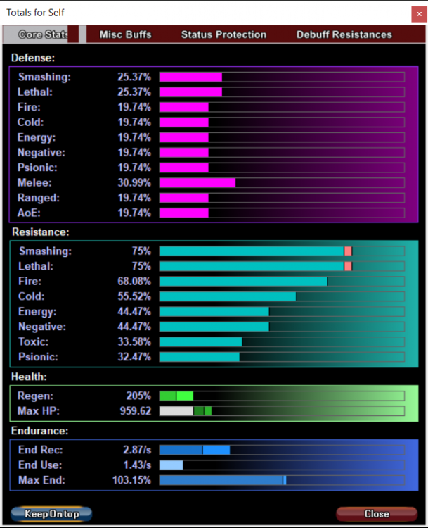 I use a fully slotted tactics, so I have accuracy there anyway. But even without it, your question really depends on the mission difficulty. +4/8 they might struggle, but I've had little issues on 3 or less. Not really no, I focus more on the resist/sustain than Defense. My melee defense is 30%, and everything else is around 19%. This is out of barrier however. Hasn't been an issue no. On paper it might be terrible, but it is fire and forget. But I do find to be a noticeable improvement. Free damage is free damage after all. I have no idea if the proc is bugged, beause it's really hard to tell. But I have my enflame slotted and proced anyway. It does great for me, but your mileage may vary. The -9.4% resistance from Lash/Corruption/Crack Whip? One lasts 2 seconds, the others last's 4 and 5 seconds. In order for you to reap the full benefit from the -res you more or less would be doing that "nonstop" to maintain the -28% resistance. Personally wither or not I take them largely depends on my secondary. Some sets like FF are very passive and have all the time in the world to take use those attacks, and the space to slot them. But Electric is a very busy set, you are healing, applying abosrb, dropping a cage, using enflame, bonfire/cc power of choice, managing pets, keeping an eye on everyone's END, so on. To me there simply isnt space in the build for them, both in power picks or slotting, or time to use in the rotation. It would be difficult to even keep a 5 second one up regularly, which would be 9.4% res debuff. I'm not saying such a thing wouldn't work, just might not be for EA's style. But if you want to give it a try then I say go for it.