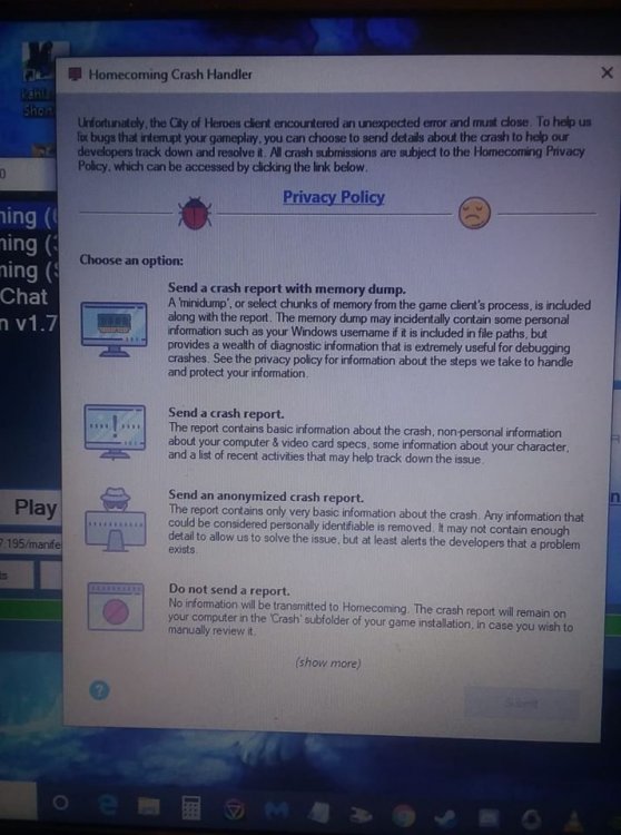 3. both myself and my cousins play CoH and recently ran into a problem. yesterday while my cousin was doing his enhancements he got kicked, restarted the manifest and he got back on but was kicked again after 20 minutes. restarted my computer and it still kicked him. i scanned my cpu for viruses and i was able to play for an hour before i logged. now again today my cousin was kicked when trying to do something. i'v tried verfing files and everything so i dont know what to do. i did select a crash report. i get this everytime he's kicked:
