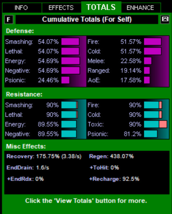 I've been playing a little with how to surive the hardcore modes. I do get that it needs a team 🙂 I would though like to do as well as possible. I am torn between shield and super reflexes. On balance though I prefer super reflexes I think. I am not very good at designing characters. It feels my goals should be 'lots of recharge' so that I can get perma souldrain (for the to hit mainly). I would like lots of hit points and resists, but I'm not sure how to get them and get the recharge, or even which is the most important I'm not very worried about damage: I have a team for that. I sort of expect there to be a kinetics on the team anyway. Procs as far as I can tell are contra-indicated for hard core. Specific questions: Should I go for more heal in siphon life? How should I go about building for more hp/resists and which resists are most important? Is recharge actually important? I picked Nerve for the alpha slot: i understand hitting things can be hard, and I like defence buffs. Is there a better choice? I picked up Elude for the 'EEEKKK' moments. I'm OK at monitoring it and 'getting somewhere else when it drops'. Will it actually help if I accidentally pull a second EB? (I don't really understand the defence mechanics at this high level end of play) Click this DataLink to open the build! Copy & Paste this data into Mids Reborn : Hero Designer to view the build | |-------------------------------------------------------------------| |MxDz;1552;703;1406;HEX;| |78DA6594594F135114C7EFB453B150965A28205B0B02A5B5D38E9AC8EA120B89481| |302C6D75ACB2D3634B469ABC177717953707971FD0CBE19DFFD068AFA19041337A2| |E278CAFFDC809949DADFDC73EE59EFB9935C4978B2D9A93342F39CCBA7CBE5D4C5F| |4F2922CB992E9C55C46D0E39D9F0BC40289642021B372B99CBB2E6B48DA856D2908| |A5317FAD48AB3999CDCB15596E656D52E6A53412E9D2125E8567B650C81B33325DC| |C2D2F62315F286564E9462D16452917EA775FA7728B572BB4CB3759CC658CB3A54C| |25974925D3E50A6D6EA30CC2F43BE9A73FAD9AA5B09CE2BC530853178E29E605509| |F067FB8F736BBC43D1DCAFBE08135E63A78F001F321384C913436D6B44D78ACDD02| |B7C9B3537976BE83B0E13DD8B4C1FC001EFAC8FC048E906797F2EC6AD17685CDCDE| |028296B94B22622A064FAE920DCAC74B8D9D2CF96FE9DEA29E9628C3CD4290F75BC| |A98D378D93B25E79A8E7AADAB82AF32BF88BAA6B54D5355E46ECC3927905ECCC301| |7C0EE61A2EE141314C1ABC27B397C37875FEB17C287AE5ABACF74401905030633C6| |8C83EB64D4A23CB6B423C76007D84B2D6955CA56EE5390F9882CDB054F4BFB37B6F| |C0EF6FD646E837FA8EA0ECC8BE5EAB88929E85B058FDC62DE66DE0107EE82BFC9B8| |4BB5ACAB8CC4074698A3E0E018739C39013AA8861E4E53F4AC42B8431E7B553ABD4| |F1066E829F319F339187EC17C09FE25E37E954E7F041EC383E0D11073881906A39C| |B693D20929E310772DCA5D8B72D762DCB558B5F93475B1637CF7C838A2CE23C2036| |6F2809DA2D93058298C280EE93409E35CBD16E78131BDE090BE7785AD4E5DA8C7AA| |AE2D4BCCD845B3BAB22091B62BFA5CBB779759B469176DED1339B420DFF84B48C43| |34D1CD4C597FF363D46C73C6B60430025BDA54F558853B0C2F614E3769169171DB7| |8B4ED845EE26FA14A9586F7C145FB56B72FFE2D5FEC56B1A2C53D9FC03047CF736| |-------------------------------------------------------------------|[/code]
