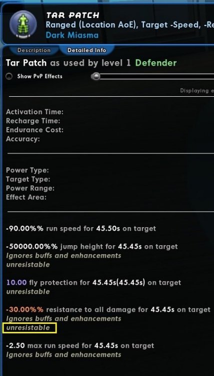 TLDR; Tar patch's Resistance debuff across all the AT's Dark Miasma, and Controller's Dark affinity, are flagged as unresistable, in both PvE and PvP. The pet version that NPCs use is also flagged this way, but only vs players. It allows for any enemy to be defeated notably faster than normal in comparison to other -Res powers, particularly against enemies with high resistances such as Hamidon or Incarnate Trials.