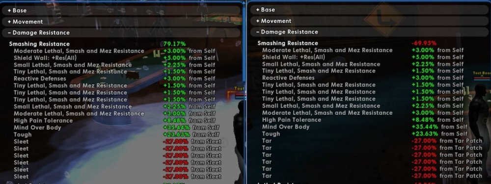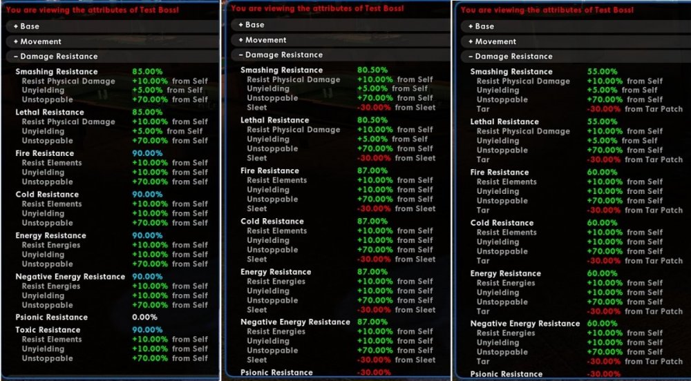 As you can see, the sleet was resisted as you would expect with 85%/90% damage resistances, with the -30% Res at 15%/10% effectiveness or -4.5%/-3% respectively, but the tar patch was flat out applied without damage resistance being taken into account.
