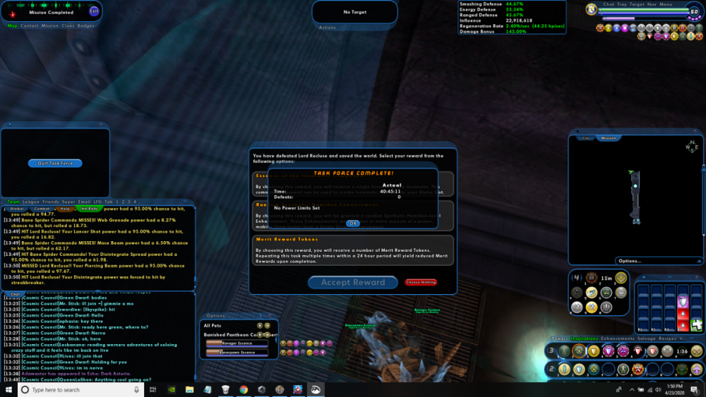 Well... I gotta tell someone, right? Completed MsLTF on my Beam/Devices hover blaster. First 4 missions were no issues... just used about half a tray of purple inspirations to get by Aeon. But up until the last mission I didn't use any P2W buffs, or Lore pets. For the 4 AVs, I pulled GW and killed her in the air so BS and Mako couldn't follow (they can't fly). It took a lot of tries to get GW down. Sometimes Siccero followed and sometimes not. The successful try he followed, so splitting wasn't terribly important. I had the 3 P2W buffs on. I think that got me through GWs big DoT. Once GW went down the other 3 went down much easier. The towers were a stopper for me... had to sleep on it and come back. I could survive Recluse by hoverblasting and keeping my defense up with purples. I also used a lot of geometry stuff to get him hopping around and attacking less. But the problem was I couldn't get the repairmen killed fast enough. I tried using trip mines, and that actually worked for 2-3 spawns of repairmen.. but eventually they triggered them and then I couldn't keep up again. I tried Caltrops thinking I could keep those up 100% indefinatly, but they didn't do enough damage. I don't have them slotted, so maybe with them fully slotted they'd do the trick as I could have 2 sets out 100% of the time and they'd be doing more damage. I couldn't respec during a TF to try it, so I went to plan D. I ended up beating the towers by using my lore pet. Basically I did damage to LR to build up agro, and held him away from the tower while my Banished Pantheon Lore attacled the tower and repairmen. The BP pet has a lot of AoE, so it killed repairmen as well, though it couldn't solo the tower completely. I still had to target and shoot repairmen and hit the tower between spawns. The added help from the pet finished the tower, but I didn't succeed every time. But eventually we got all the towers down one at a time (went though 7-8 tries). I did the blue tower first so I didn't purples inspirations after that to stay alive. Lord Recluse was pretty rough. Again, I had the P2W buffs in me, which helped push me over the DPS line and keep me alive though some of his attacks. When the channelgun hit me (which debuffs endurance regen by a ton) I had to stop attacking until the buff wore off. When he started spawning minions I dropped my lore pet again to help clean those up. Took several very long tries, but finally got him down. I also killed the flier about 10 times just to keep him out of the way. And I had the time waiting around for the lore pets to come off cool down. This was by far the hardest challenge I've completed in this game.