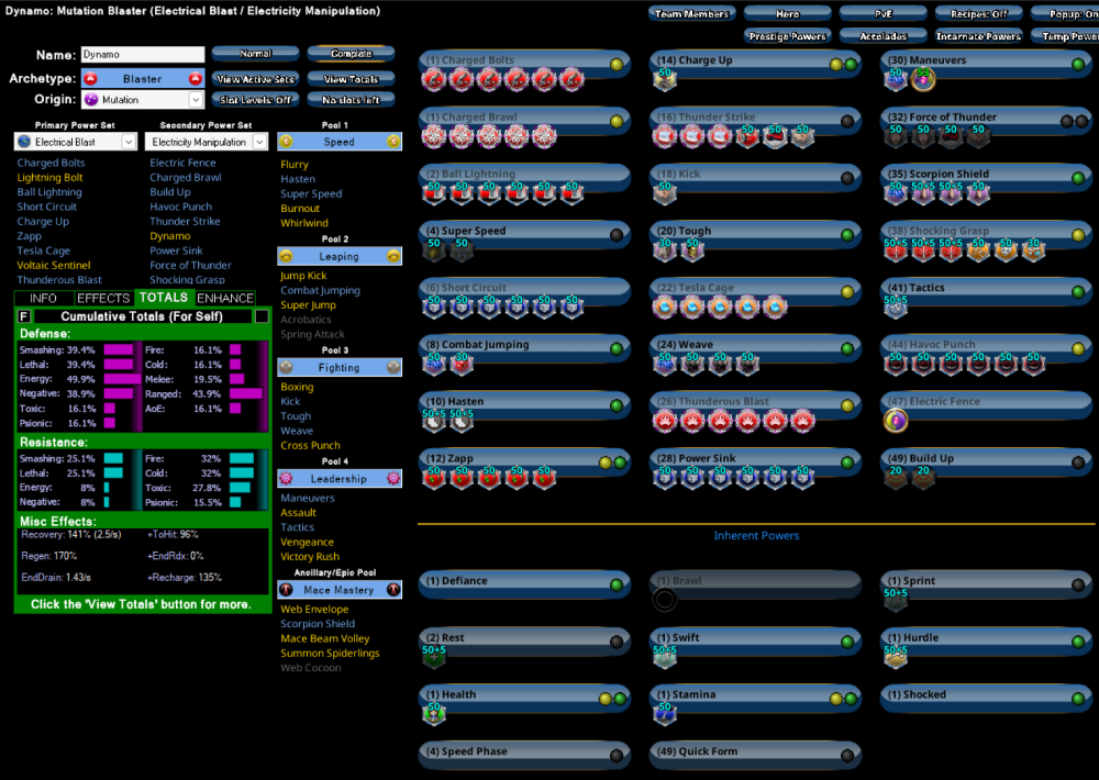 After a discussion with Nemu, and going through his build here, I've tried making an Electric/Electric version. No hover, which I think I'll miss for some Hover blasting. But, a lot more knockdown mitigation. Much better up close defence and a quick AoE knockdown to set up end drain powers. Original post here: https://api.midsreborn.com/legacy/download?uc=1673&c=753&a=1506&f=HEX&dc=78DA65944B4F135114C7FFD399B18054C0F27EB6205A5B5A90045D99101E55A14D887C0052DB11466BDBB42511F7EED5684C04D4A5CF4FE156A34697EE5C0B262E7CA0194FE7CC918B9D64667E73CFE3DEFB3FF74CFAFA5CF39BD7A9696881D97CA6525999A167D52A37A4D7AB99AA5D2C80AE8E05EB8675C9CA87E6ACBC9DA984ECC933A1A5293F597A3CF7958B99C2AA954B24EDB2C5292262595E2F958AE56A623E6F65AB653B6B573756D299825D5ACFF304CD4BC5623E91B23225BBB0DAE47E2C972C2B17703169AFAE55C9D0225E39AB5C59B34B3DF3253B9B9049D299AC458F1A6F74D3BAC2744FD796AE412EC7A487019C3270021AC349F804740183210A93C1FA2F0D8DDE624B036E0BDC6168C25D817B0C33B56075111A74D3B5F86008980C060E311C825FA081A193C4D695349A8E0ECD0BFA4303030646C8C5545D4C7CF2B92ECDE8D35D182617BFEAE2470C9E8B073E7269C4BE0B7D3874619E3E0EEFCBE0D0C753CADE6E40A788809A34802ECD5DD1114CF2BC5768BC655F05C76CC116CBD38A6D81C70CE338EBF3E0338F4CE0268F2429B64DAD441B9EB0CB513C1378CED08D170CBD78C9709942826A2582F8CE9676FC10F8C9D0895F027B92EF37C3B95A3FA88BE8C05B96EE38DE09BC17F800EFC07D643048AC2E255AEF923AF6225913AB11092C308C6391E53B5F6B3475E53D78C096416C3284B1C5700CDB020F051E315CA5D83EED5F0D1DB34F04E81701FA45804111202C0284458036DAC2805AEF01D9C220A668C0AFC3A6D7907258F421A4B88421A405BCEA86A4BA7BADC0B02ACDB0E41DC10E2B32825D816FBCA73C798EAAD28C22E2F3248FFABC468E095C6088E31A274E20C32735487B8A28691071FF20E4324BAF983A414CFA774CFA774CFA774CFA372EFD1B97FECD516C429D2081D3B5DF918E357A4D280DA74D608B9619AC9DFB4D86B071F00FE4F41B502FC71DA4264DD58F37F296970C350359348EF8D2743035DD71DEF84EBD25C296DD7A4B98ABF1B5DE729FE77F15A59F9332BFB3183DB86DE72FA72AD2DF Dynamo Elec Elec Blaster v3.mbd