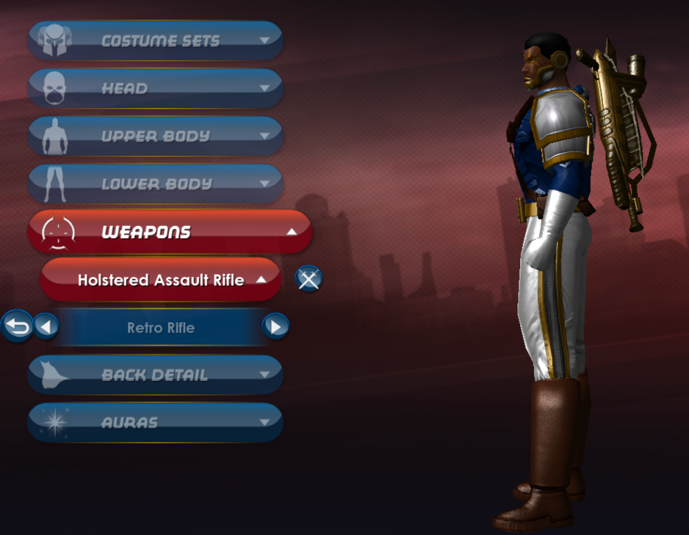 This is such an exciting and welcome addition, thanks for adding this ! Just flagging that the "retro rifle" seems to float above the character whereas all of the other versions i tried looked perfectly flush. Just flagging since iirc this was an issue that was fixed with the melee weapons in the previous patch. Screenshot attached for reference and I tested this on both Blaster and Mastermind archetypes both with and without a "backpack" costume piece added. -