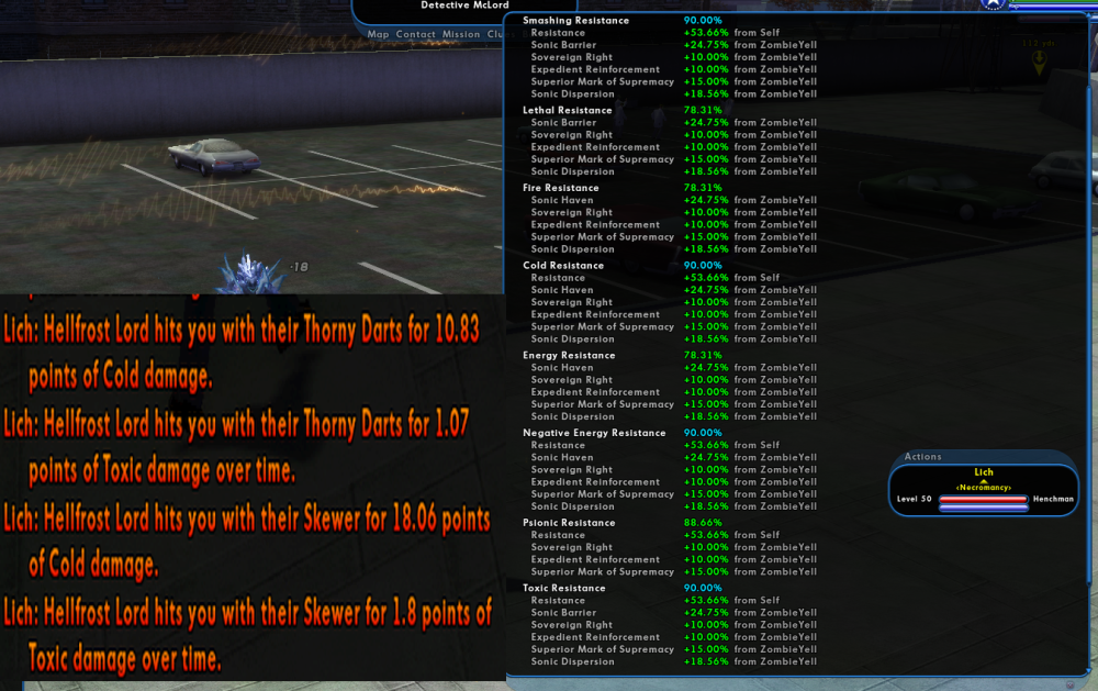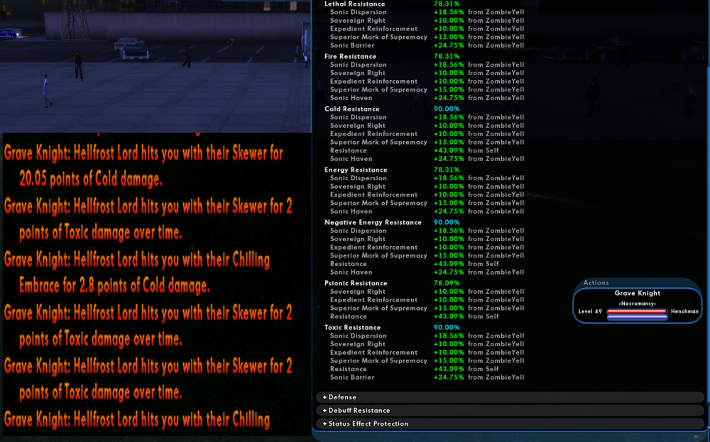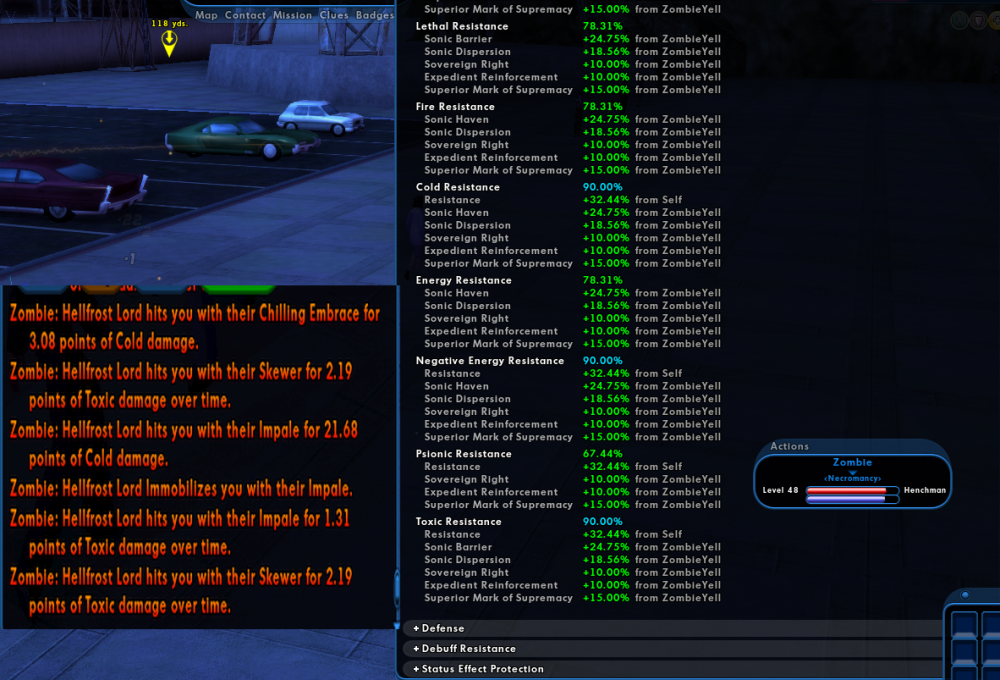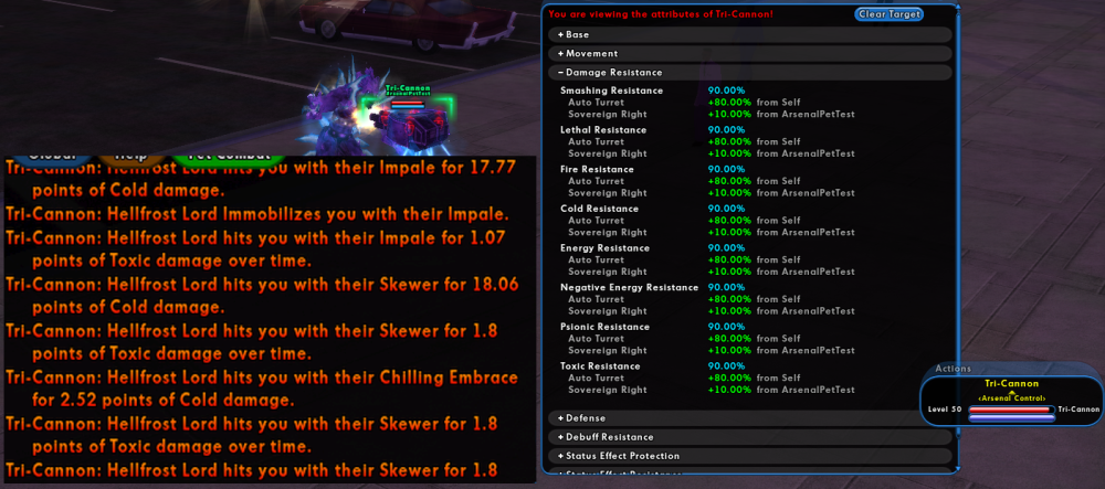 I've done a bit of light testing with an arsenal controller with the beefy gun drone pet and one res aura enhance to 90% res cap it. Parking in an AE against a specific elite boss (Using SS I believe, so only smashing damage) doing one damage type and watching as it just predictably takes damage in a very slow steady trickle and predictable values over a very dull but informative 6 minutes. No buffs except the raw arsenal controller pet with one +10 res enhance to make it capped. Which struck me as odd, as it's only around 600-ish HP max otherwise with zero def? Not too far off and maybe even less health and certainly less def than one of my zombies on my Necro/Sonic MM. And my experience with them and their expected durability is far different. So I do the same thing with the same EB that does the same smashing damage type that the zombie is resist capped to, and the damage he takes feels so much more swingy and unpredictable. And sometimes it feels like he takes a devastating hit contrary to their actual resist values. It almost feels like the game from time to time "Forgets" my zombie's resist values at odd intervals or ticks. The chosen EB also did no -res, only -def which changes nothing since the gun drone also has 0 def. I am also NOT letting my sonic buffs lapse either. I am also NOT running in bodyguard mode for the test, I have aggressive on and I gave one single fully upgraded zombie horde zombie the attack command and let him have at it with the EB to take some hits. So my strange hunch is that maybe some of the fragility of (some?) MM pets may be due in part to some sort of oddity with how their defenses and resist values or upgrades calculate maybe? Like their state of having defense or resist is somehow tracked with ticks or has to be constantly server checked. And sometimes you hit a "Sour" tick and the game forgets momentarily that they have resist at all. Or maybe the culprit is instead due to defender style second hand +res buffs. Like sonic might be the outlier since they're not originating from your character when applied to you, like your own native scrapper/sent/tanker toggles so they are being calculated oddly. If anyone a little more in the know about MM pets could test or help sus this out I would also appreciate it. There has to be something obvious I'm overlooking.