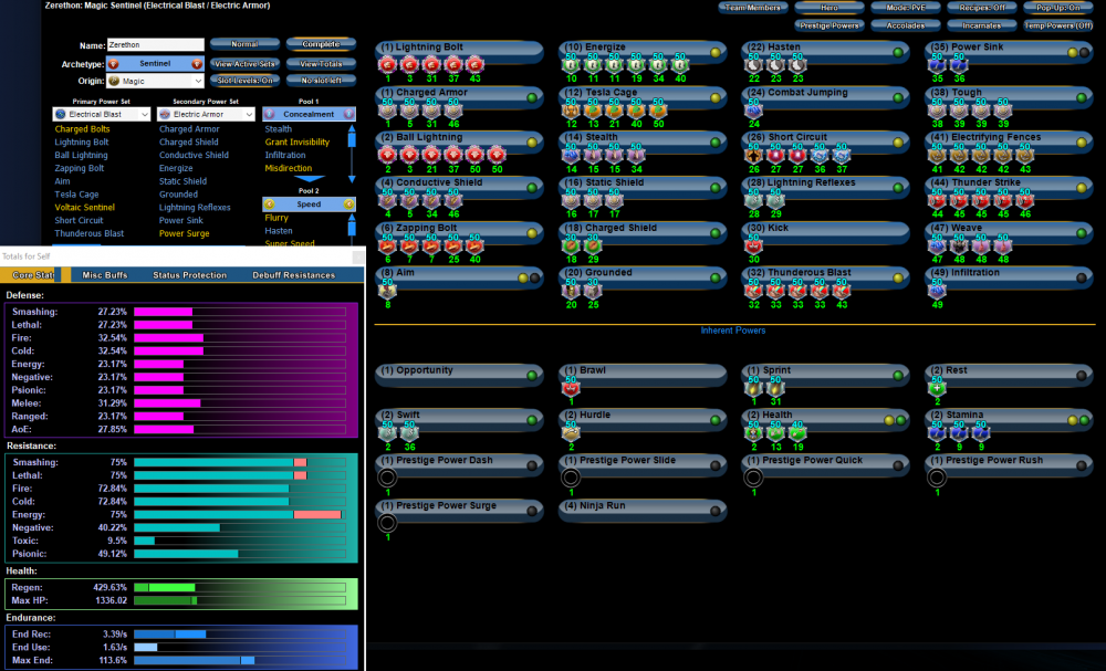 I'll send you a message with the full mids build, but here you go (Stats are L50, just IO's/sets, no boosted IO's or incarnates): (One minor change i just noticed, i have the synapse proc in STAMINA instead of an Endmod/Rech Perf shifter, and a different synshock in Short Circuit nowadays, i'll correct the file/build before i send it) Doing the ouro intro arc i was on +1/x8 with no issues even on the shivan mission that i farmed a few times for the 200 shivan defeats badge (So that's +1x8 at Level 15, scaled down), +1/+2 x8 rikti misssions are easily solo'd, Neg/Psi you could do better, but they're a bit rarer and the heal/regen makes up for it, especially with SentWard procs and energize I've got enough defense across the board to not care most of the time anyways, +4/x8 takes some extra movement if you're solo, but in a team, what bit of aggro you get or splash damage isn't generally even scary. Incarns i run Agility Radial Alpha with Preemptive core interface for even more endurance drain and defense, Assault for hybrid to help with damage when needed. Ageless for more rech. Ion Judgement Cage form + Storm elementals because why not fully be the fun police? more or less, even scaled down to the earliest TF's +0/+2 x8 is doable, and the higher the level the easier it gets, L50+ +1/+4 is all equally doable, as long as you prioritize the right targets or just nuke all their end to 0 and keep it there Even GM's/AV's are easily tanked if you shred their end to nothing, carry some standard-issue poison daggers for the -regen and you can even solo quite a few. It's definitely not as speciallized as some builds, or as purely deadly/durable, but it also can basically plow through enemies with little care. Regardless of what they are (Just watch for toxic damage) And yes, there's no travel power until technically 50, you don't need it. LR+Swift+Sprint+NR/AR/BR can hit over 80mph run speed, without NR/AR/BR you run around 65-70mph with just sprint, once you get infil it's an LOTG holder but it replaces NR/AR/BR when you're not scaled down. You can swap it for power surge while finishing the build to help with resistances in sketchy situations, but mind the crash. Oh yeah, never forget that the heal has a +regen and -end cost effect as well, so even if you're not NEEDING it as a heal, it's still worth popping for those buffs -