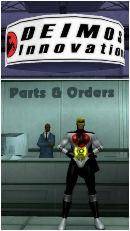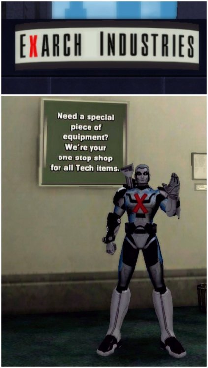 Spokesheroes for the Enhancement Stores of Paragon City Free Radical - Deimos Innovations Presto Pandora - Pandora's Box Dragon Dynamic - Future Dynamics Exarch One - Exarch Industries Purple Power Puncher - BiotechiX