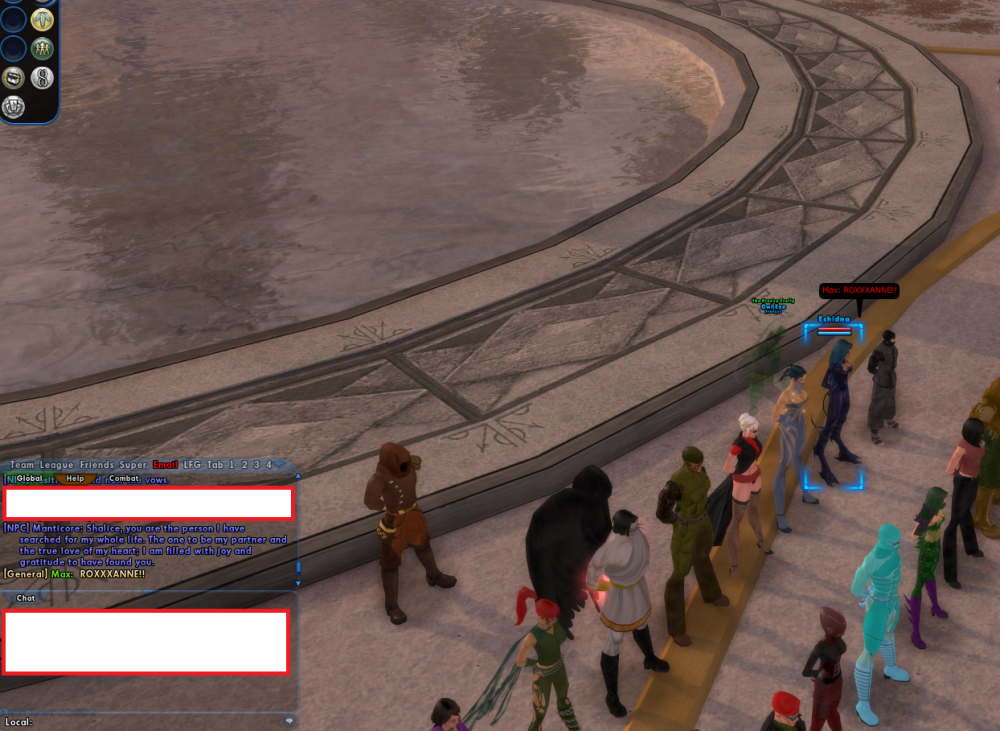 I've been running the wedding mission once each on a number of characters for a couple of hours now. Unexpectedly, while on my Archery/Ninjitsu Sentinel, I ran into a bug. There was someone named Max (didn't gather global name or other information) chatting in the General global channel along with everyone else. For some reason, anything they said came out of the non-combat version of Echidna during the pre-ceremony and ceremony phases. I didn't see any more player chat coming from an NPC for the rest of the mission once the combat started, but it could have been due to Max not speaking while another Echidna was spawned?