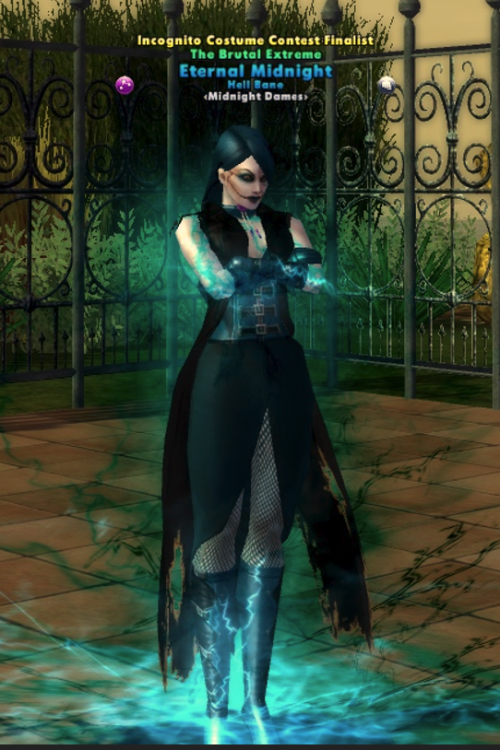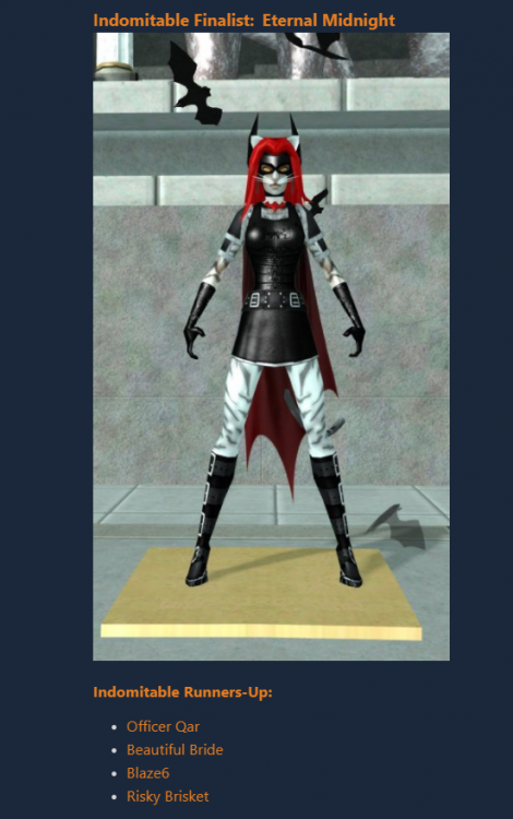 14. Hey Theme Teamers! We were talking in game about the Incognito costume contest and that I somehow surprisingly won the Indom finalist slot with Eternal Midnight. I didn't win overall, but it was fun to win our server. In case you didn't see it, the results are here: And here is a screenshot of the 5 of us from Indom with yours truly in the center. I could hardly believe I won! If you remember this was a costume created for Trixie's theme months ago of a dog or cat dressed as a superhero, so I made a cat dressed as Batwoman for that week. The concept fit perfectly in the Incognito theme so I didn't even have to do anything! And here is a picture of her in her normal costume with her new title 😄 The best part (besides all the millions as prizes) is the giant monster fight afterwards and I got the Hell Bane badge for the elusive Caleb, among others!
