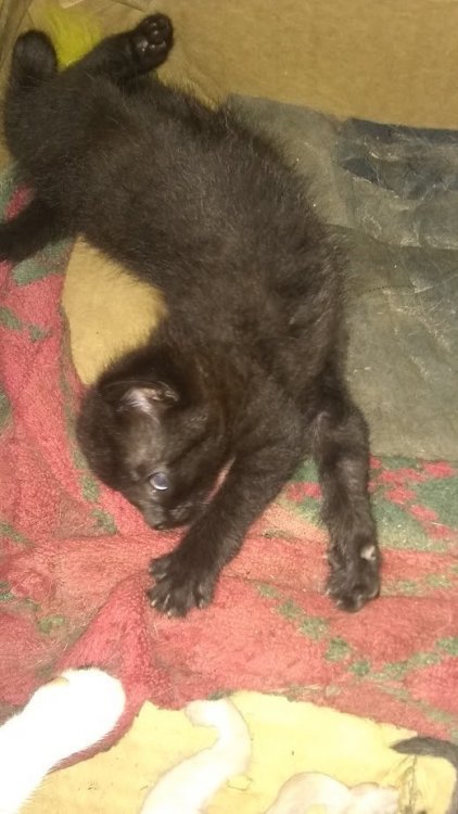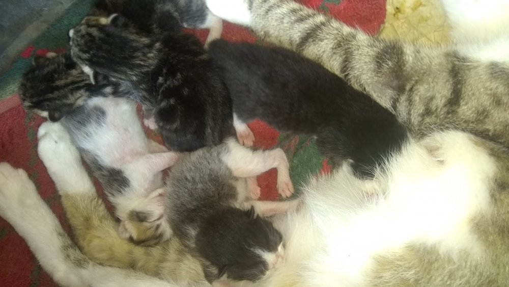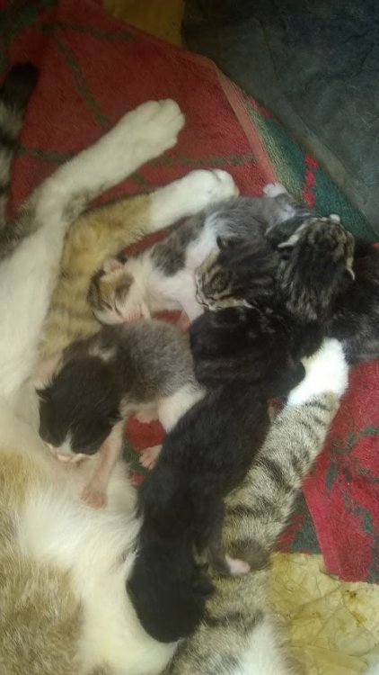 Well, Jessica doesn't like Bunny. And May hates Bunny. Until a few days ago, Bunny was becoming more and more antagonistic toward May. May would hiss, Bunny would stop what she was doing and walk right up to May, stand there, ears perked forward... she was saying, "Okay, bad-ass, do it." That sent May into paroxysms of hiss-snorts, and, not knowing what was happening, I assumed May was just being her usual nasty self (she just doesn't like any other cat. she's okay with Jessica, but she loses it when she hears or sees one of the outside cats), and I'd yell or stomp a foot to break it up. It wasn't until I saw Bunny standing up to May that I understood the situation, and by then, May was constipated. Poor thing was stopped up for three days and in serious pain. She did, finally, loosen up and do her business, and I've been actively moving Bunny away from her to prevent any further confrontations. But I have to say, I really like the way Bunny handles herself. She could've responded in kind, but she didn't. She could've turned aggressive and attacked, but, again, she didn't. She turned around and told the bully to step up or shut up. This is definitely my kind of cat. Other than me being her only friend, she's great. She's grown nicely, she's highly active and very affectionate. Loves to play by herself, loves to play with me (favorite game is pretending my hand is a kitty her size. lots of jumping and faux attacking... she never uses her claws on me, though. she's very careful not to hurt me). She did, though, bring friends with her. Ear mites and fleas. The mites were "easy" to deal with, bought some pyrethrin and aloe drops and treated her daily for a week, then one more time a week later. The fleas... I don't have carpets, but they didn't take long to spread, so all of the cats are wearing Seresto collars now. Expensive, cut into my freezer and new bike budgets, but we're getting them under control now. On another front, about a year ago, a cat showed up at the farm where I earn a little money on Mondays and Tuesdays. I convinced the farmer to keep her around... his wife has Alzheimer's, and I've watched her deteriorate over the last five years. Two years ago, she lost any ability to hold a conversation, and she's all this old man has for company. They used to do everything together, now... well, I figured he was pretty lonely and a cat is always good company. I was also hoping it would provide some stimulation for the wife. I know she can't remember anything past three seconds, but endorphins leave a lasting effect and, again, cats are good for that. Anyway, that cat was pregnant, delivered three kittens. Farmer gave away one, the other two, both female, settled in. Farmer wasn't thrilled about having three cats (wasn't thrilled about having one, actually), but allowed them to stick around. Then more pregnancies (all of the kittens disappeared), and he started to really become upset. So a couple of weeks ago, I rehomed all three to my cabin. They're outside cats, so they're perfectly comfortable being out there... Two of them, the original and one of the younger ones, each had a kitten that I almost missed. The first was one of the younger cat's litter, the only one that hadn't run off or... whatever happened to the others. I trapped that one a couple of days after rehoming the three and brought her out here to be with her mama. This past weekend, I took her to a forever home, so she's fine. The second kitten... that was almost my worst nightmare come true. I didn't find her until a week after rehoming the three, and she wasn't old enough to eat solid food. She starved for a week. I was in tears when I picked her up, listening to her screams of hunger and fear. Rushed home immediately and reunited her with her mother, then rushed to the nearest vet, 30 miles away, and bought kitten milk replacement because I figured mama had probably stopped producing after a week with nothing nursing. I stopped on the way back to buy a tiny bottle and sloshed together a milk solution as soon as I returned. This was my first experience bottle-feeding anything, but we figured it out together. That was a week ago. Little Violette is doing very well. I didn't wait for her to tell me her name, I chose Violette for her. Violette Szabo is a WWII personage who fascinated me, and I thought the name appropriate for a kitten who almost died (my fault, i'm going to be beating myself up for this for years). Of course, this rabbit hole goes deeper. A day after I brought Violette to the cabin, one of the younger cats had a litter of five kittens. Two cinnamon buns, one tuxedo, one that looks very much like the litter's mother, and that magnificent little one at the 9 o'clock position is... wow. Black mask, fade pattern cape, have to love that. People always say that cats aren't social, they're completely independent, blah blah blah. Completely untrue. Violette's mother, Naomi, is actively helping this one, Emily, raise her litter. She's wet-nursing, she's staying in the box to help keep the kittens warm, she's even going full-on bulldog, charging out of the box and ready to rumble if she hears or sees anything she considers threatening. The third of the cats I brought home is Sara, by the way. Sara's kitten was the one I trapped and gave to a very appreciative woman who worked at the store where I bought the tiny baby bottle. All three of these cats have always been mine, in the sense that they come to me for affection, attention, food and companionship. Bringing them back to the cabin was a long overdue move. Of course, this means Camille, Arthur, Madeline and Jacob don't come around any more. It breaks my heart, because I really do love those cats, too... But Bunny's sister, Bonnie, decided to live here, and the trio leave her alone, so I still have one of that family as part of my family. So Violette has three mothers now, and she's thriving. Emily treated her like one of her litter, including nursing her, so my