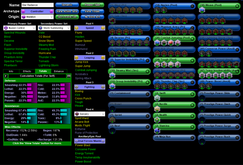 1. Sorry for all the posts, the attach file forum system made me mad... I get it, now. Here is the report : Hero Plan by Hero Hero Designer 2.23 https://github.com/ImaginaryDevelopment/imaginary-hero-designer Click this DataLink to open the build! Star Radiance: Level 50 Mutation Controller Primary Power Set: Illusion Control Secondary Power Set: Storm Summoning Power Pool: Speed Power Pool: Experimentation Power Pool: Leaping Power Pool: Fighting Ancillary Pool: Primal Forces Mastery Hero Profile: Level 1: Blind (A) Basilisk's Gaze - Accuracy/Hold (3) Basilisk's Gaze - Accuracy/Recharge (3) Basilisk's Gaze - Recharge/Hold (5) Basilisk's Gaze - Endurance/Recharge/Hold (5) Lockdown - Chance for +2 Mag Hold Level 1: Gale (A) Sudden Acceleration - Knockback to Knockdown Level 2: Spectral Wounds (A) Tempest - Chance of End Drain (7) Tempest - Damage/Endurance (7) Tempest - Accuracy/Damage (9) Thunderstrike - Damage/Endurance/Recharge (9) Thunderstrike - Accuracy/Damage/Recharge (11) Thunderstrike - Accuracy/Damage/Endurance Level 4: Deceive (A) Malaise's Illusions - Accuracy/Recharge (13) Malaise's Illusions - Chance of Damage(Psionic) (15) Malaise's Illusions - Endurance/Confused (15) Malaise's Illusions - Accuracy/Endurance (17) Malaise's Illusions - Confused/Range (17) Malaise's Illusions - Accuracy/Confused/Recharge Level 6: Flash (A) Basilisk's Gaze - Accuracy/Endurance/Recharge/Hold (19) Basilisk's Gaze - Accuracy/Recharge (19) Basilisk's Gaze - Recharge/Hold (21) Basilisk's Gaze - Accuracy/Hold Level 8: Hasten (A) Recharge Reduction IO (21) Recharge Reduction IO Level 10: Steamy Mist (A) Luck of the Gambler - Recharge Speed Level 12: Group Invisibility (A) Luck of the Gambler - Recharge Speed Level 14: Combat Jumping (A) Luck of the Gambler - Recharge Speed (23) Reactive Defenses - Scaling Resist Damage (23) Kismet - Accuracy +6% Level 16: Freezing Rain (A) Touch of Lady Grey - Defense Debuff/Recharge Level 18: Phantom Army (A) Expedient Reinforcement - Accuracy/Recharge (25) Expedient Reinforcement - Accuracy/Damage/Recharge (25) Expedient Reinforcement - Endurance/Damage/Recharge (27) Expedient Reinforcement - Accuracy/Damage (27) Soulbound Allegiance - Damage/Recharge (29) Soulbound Allegiance - Chance for Build Up Level 20: Kick (A) Accuracy IO Level 22: Tough (A) Steadfast Protection - Resistance/+Def 3% (29) Steadfast Protection - Knockback Protection (31) Aegis - Psionic/Status Resistance (31) Impervium Armor - Psionic Resistance (31) Gladiator's Armor - TP Protection +3% Def (All) Level 24: Weave (A) Luck of the Gambler - Recharge Speed (33) Shield Wall - +Res (Teleportation), +5% Res (All) (33) Shield Wall - Defense/Endurance Level 26: Spectral Terror (A) Unspeakable Terror - Accuracy/Fear/Recharge (33) Unspeakable Terror - Accuracy/Recharge (34) Unspeakable Terror - Fear/Range (34) Unspeakable Terror - Accuracy/Endurance (34) Unspeakable Terror - Disorient Bonus Level 28: Thunder Clap (A) Stupefy - Accuracy/Recharge (36) Stupefy - Endurance/Stun (36) Stupefy - Accuracy/Endurance (36) Stupefy - Stun/Range (37) Stupefy - Accuracy/Stun/Recharge (37) Stupefy - Chance of Knockback Level 30: Superior Invisibility (A) Luck of the Gambler - Recharge Speed Level 32: Phantasm (A) Expedient Reinforcement - Endurance/Damage/Recharge (37) Expedient Reinforcement - Accuracy/Damage (39) Expedient Reinforcement - Damage/Endurance (39) Expedient Reinforcement - Accuracy/Damage/Recharge (39) Force Feedback - Chance for +Recharge (40) Sudden Acceleration - Knockback to Knockdown Level 35: Tornado (A) Expedient Reinforcement - Endurance/Damage/Recharge (40) Expedient Reinforcement - Accuracy/Damage (40) Expedient Reinforcement - Damage/Endurance (42) Expedient Reinforcement - Accuracy/Damage/Recharge (42) Force Feedback - Chance for +Recharge (42) Sudden Acceleration - Knockback to Knockdown Level 38: Lightning Storm (A) Thunderstrike - Damage/Endurance (43) Thunderstrike - Damage/Recharge (43) Thunderstrike - Accuracy/Damage (43) Thunderstrike - Accuracy/Damage/Recharge (45) Force Feedback - Chance for +Recharge (45) Sudden Acceleration - Knockback to Knockdown Level 41: Conserve Power (A) Recharge Reduction IO (45) Recharge Reduction IO Level 44: Temp Invulnerability (A) Unbreakable Guard - +Max HP (46) Impervious Skin - Resistance/Endurance (46) Impervious Skin - Resistance/Recharge (46) Impervious Skin - Endurance/Recharge (48) Impervious Skin - Resistance/Endurance/Recharge (48) Impervious Skin - Status Resistance Level 47: Energy Torrent (A) Detonation - Damage/Recharge (48) Detonation - Accuracy/Damage (50) Positron's Blast - Accuracy/Damage (50) Positron's Blast - Chance of Damage(Energy) (50) Overwhelming Force - Damage/Chance for Knockdown/Knockback to Knockdown Level 49: Speed of Sound (A) Quickfoot - Endurance/RunSpeed Level 1: Brawl (A) Empty Level 1: Containment Level 1: Prestige Power Dash