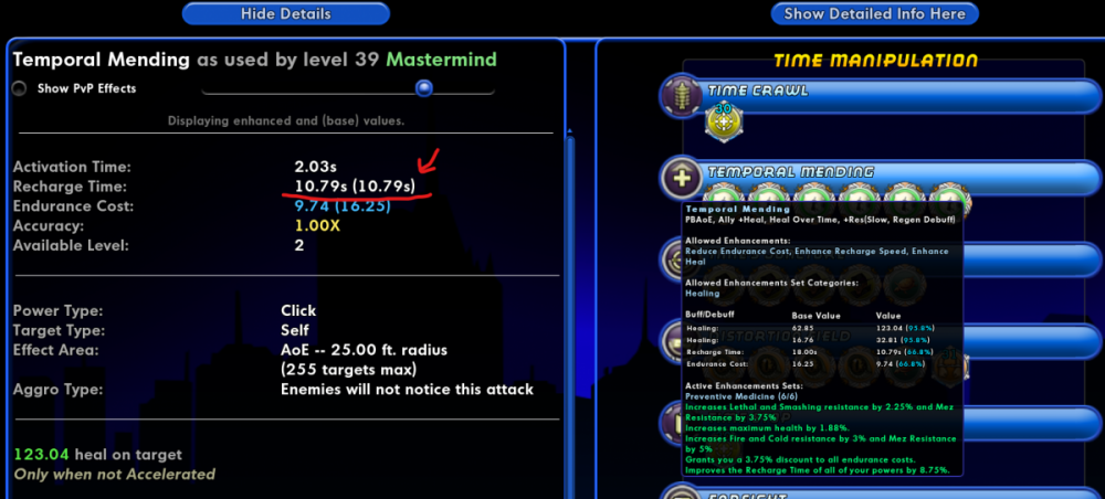 1. Expected: In the Manage Enhancements screen (Detailed Info subscreen), the value in parentheses for Recharge Time should display the base recharge time of the selected power. Actual: The value in parentheses shows the enhanced recharge time, which duplicates the value not in parentheses. Verified this on all powers with Recharge Reduction enhancements across three characters. Appears to be a display error only. Tooltip still shows correct base value. Screenshot attached showing Detailed Info display bug and correct tooltip.