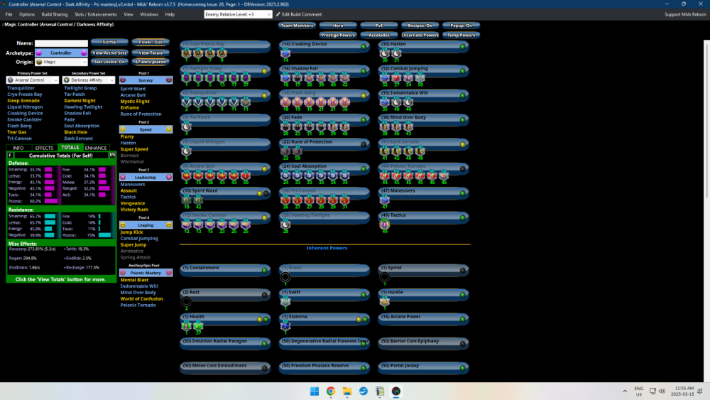 Glad to be of help. To get a better sense of how the mind / dark / fire build is intended to work, look at the "totals" tab on the bottom left hand side of the screen. Then toggle on gather shadows and unleash potential. Then look again at defense and recovery totals in the "totals" tab. You'll see both defense and recovery totals spike. The key to getting that to happen in-game is to cast gather shadows first, followed by unleash potential before the buff from gather shadows runs out. That combination is intended to provide good "peak survivability" when the going gets too rough for an occasional use of life drain to keep your dom in the fight. It can also help to fix endurance problems when a domination end bar refill won't happen for a while. Barrier core tier 4 also helps with peak survivability, as does melee core tier 4 hybrid. Stagger when you use them and unleash potential so you always have at least one of them running when taking on dangerous content. If you'd like to carry this idea even further, you can get the demonic aura accolade, then convert to hero-side to make it Geas of the Kind Ones if you'd rather run a hero or vigilante, for a 1 minute buff to help cover periods when your other "peak survivability" tools are not enough or not available. This way of organizing peak survivability helps quite a bit when in melee against archvillains, giant monsters, or elite bosses. Also, the "chance for +damage" proc in midnight grasp can get up to 3 stacks if you're chaining together single target attacks. That can add noticeably to damage, so bear that in mind when figuring out which single target powers to use and in which order. None of these ideas tie you to trying out the build provided above, though. By all means, borrow and/or adapt whatever you like and ignore whatever you don't.
