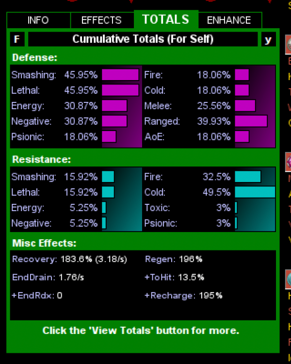 I've not built for def on mine. I had the two "3% def" IOs when levelling but found the slots were more useful elsewhere. It would have gimped me a bit to try for 32, I'd rather get everything else available all the time. So priority was rech then res/regen. Tri-form with Perma LF/ hasten/inner light/dull pain and it just kind of soaks up damage. I've got a full AoE attack chain post 27. Sometimes it can get a little hairy but ultimately fine: we have 3 heals and enough knockdown to give yourself a break. Hard agree, but I would also like to add how irritating freaks are on Yin.